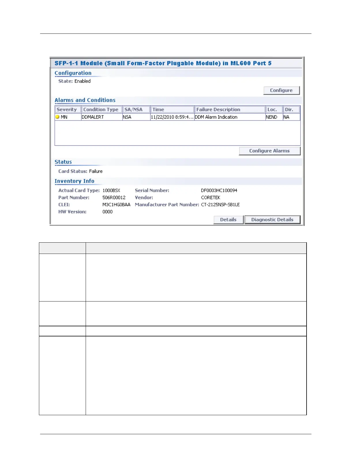Diagnostic Details - This button provides access to the DDM (digital diagnostic memory)
