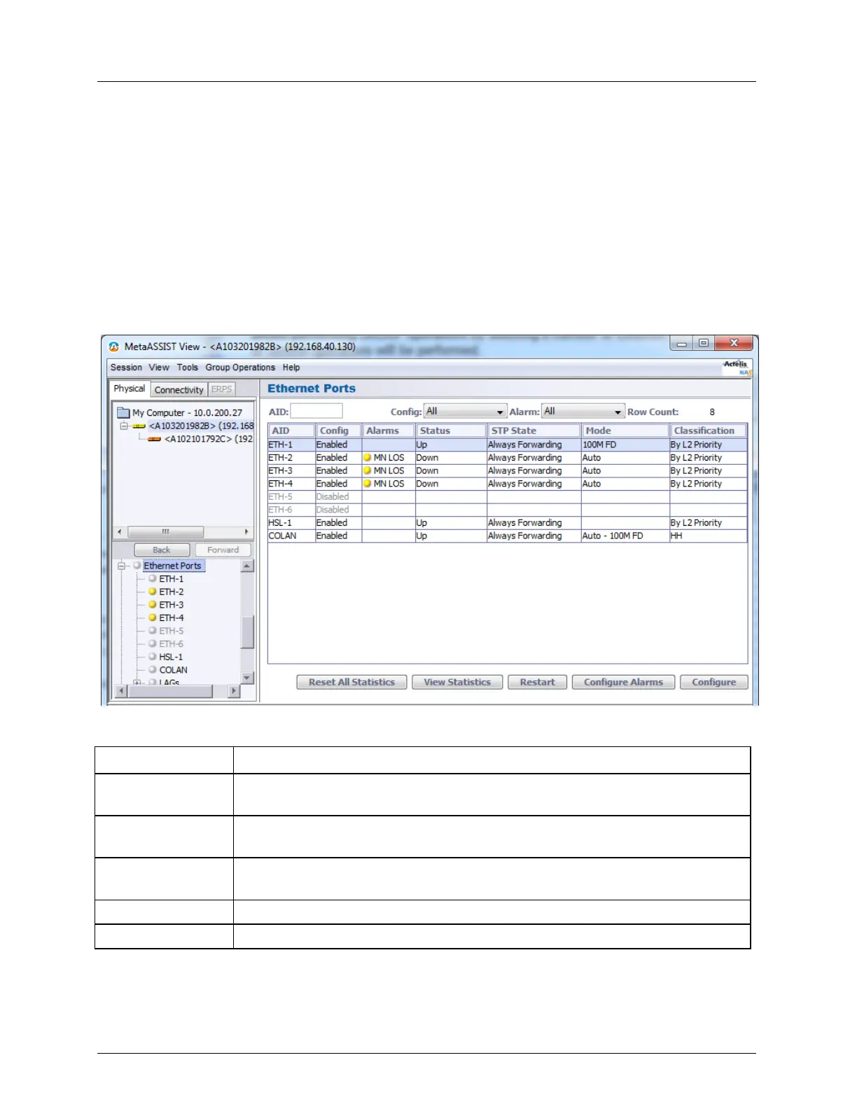 Several views are available for Ethernet ports configuration, monitoring and analysis. Each