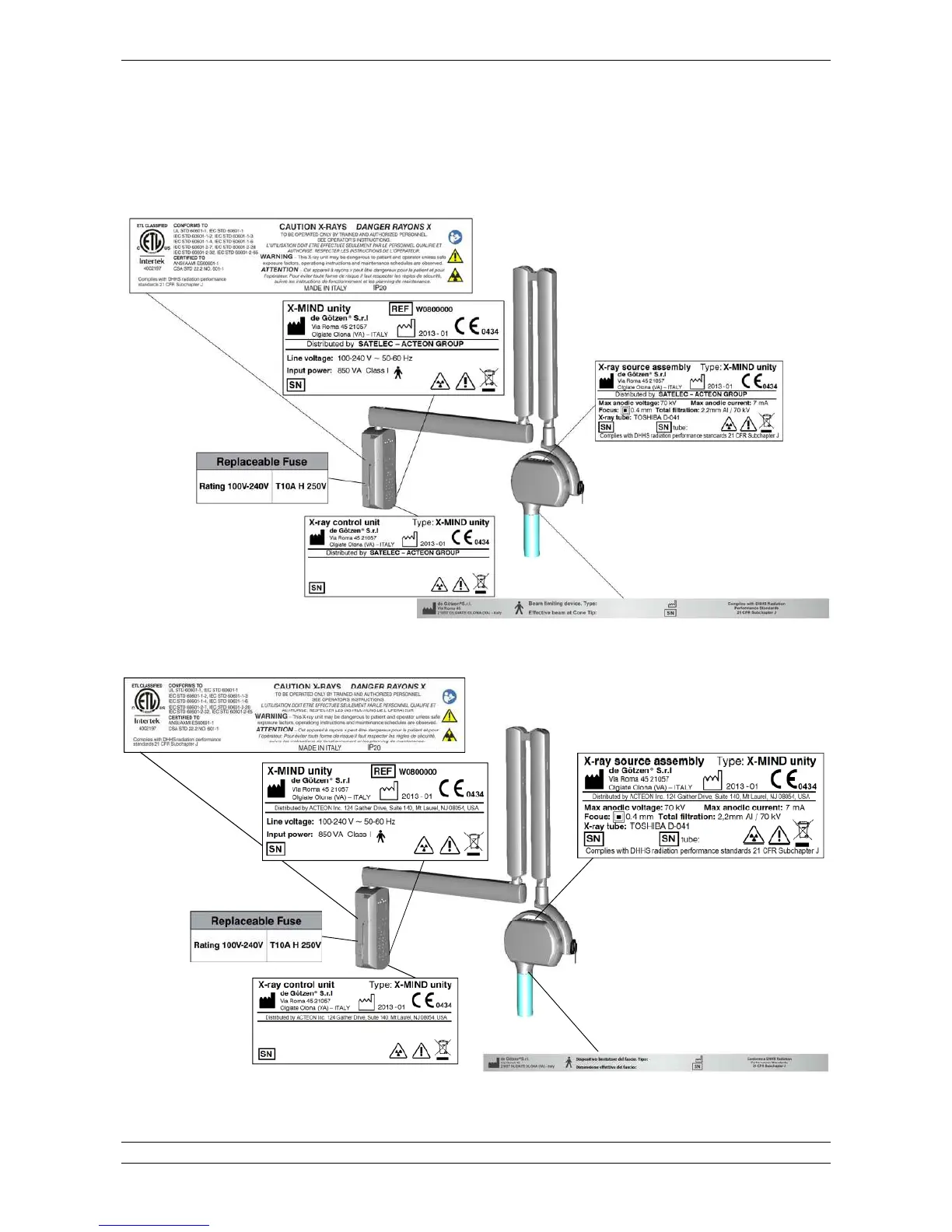 The identification tags on the tube head, on the timer and on the cone indicate the model number, the serial number, the