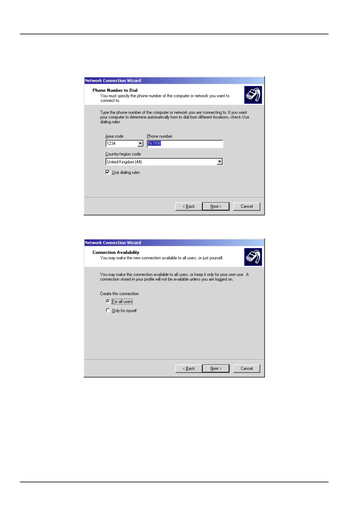 4. Configure the phone number to dial as shown below, then click Next. (The modem
