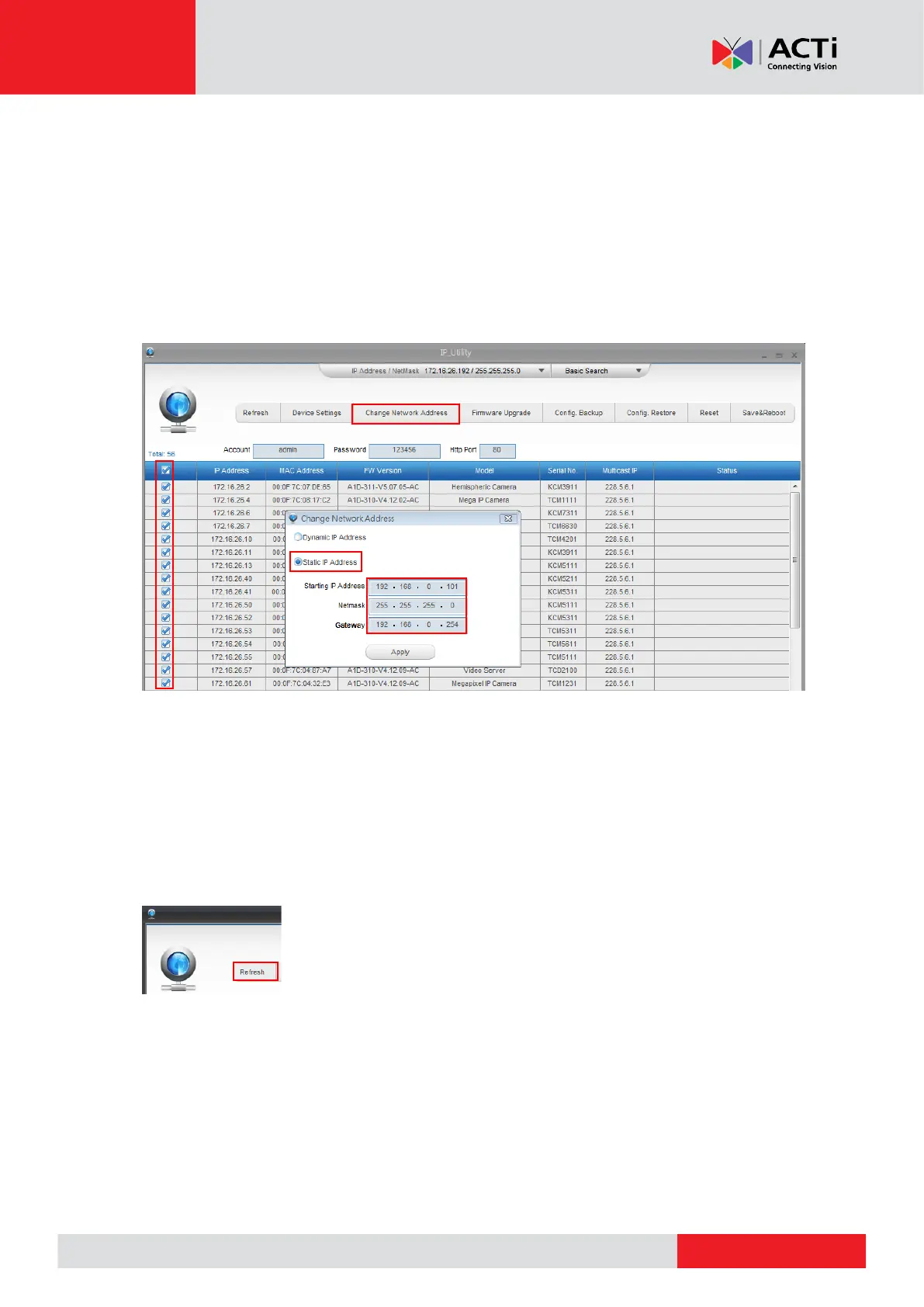 Later, by pressing the “Refresh” button of the IP Utility, you will be able to see the list of cameras