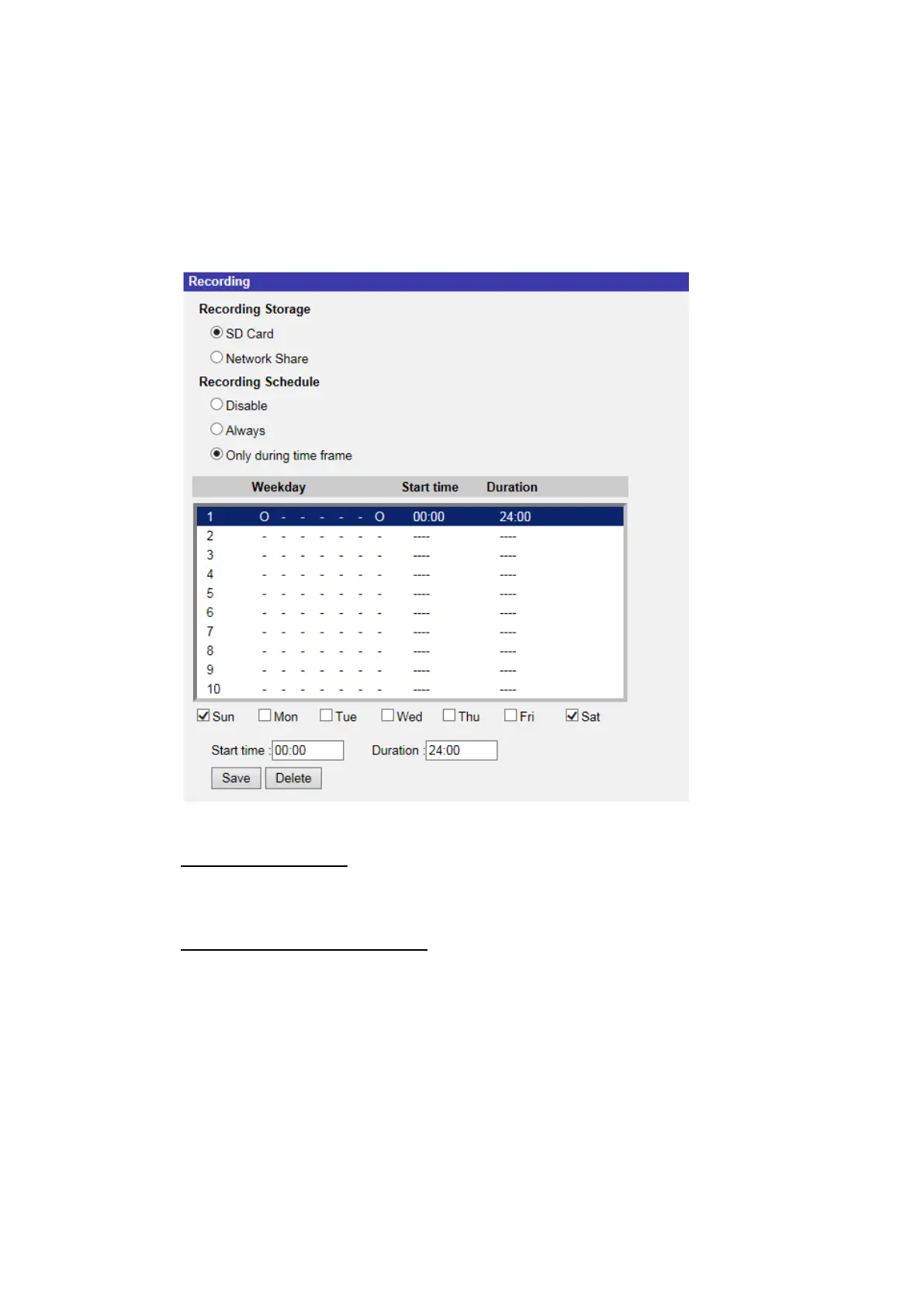 period (hour:minute) to activate the recording at certain time frames. The setting