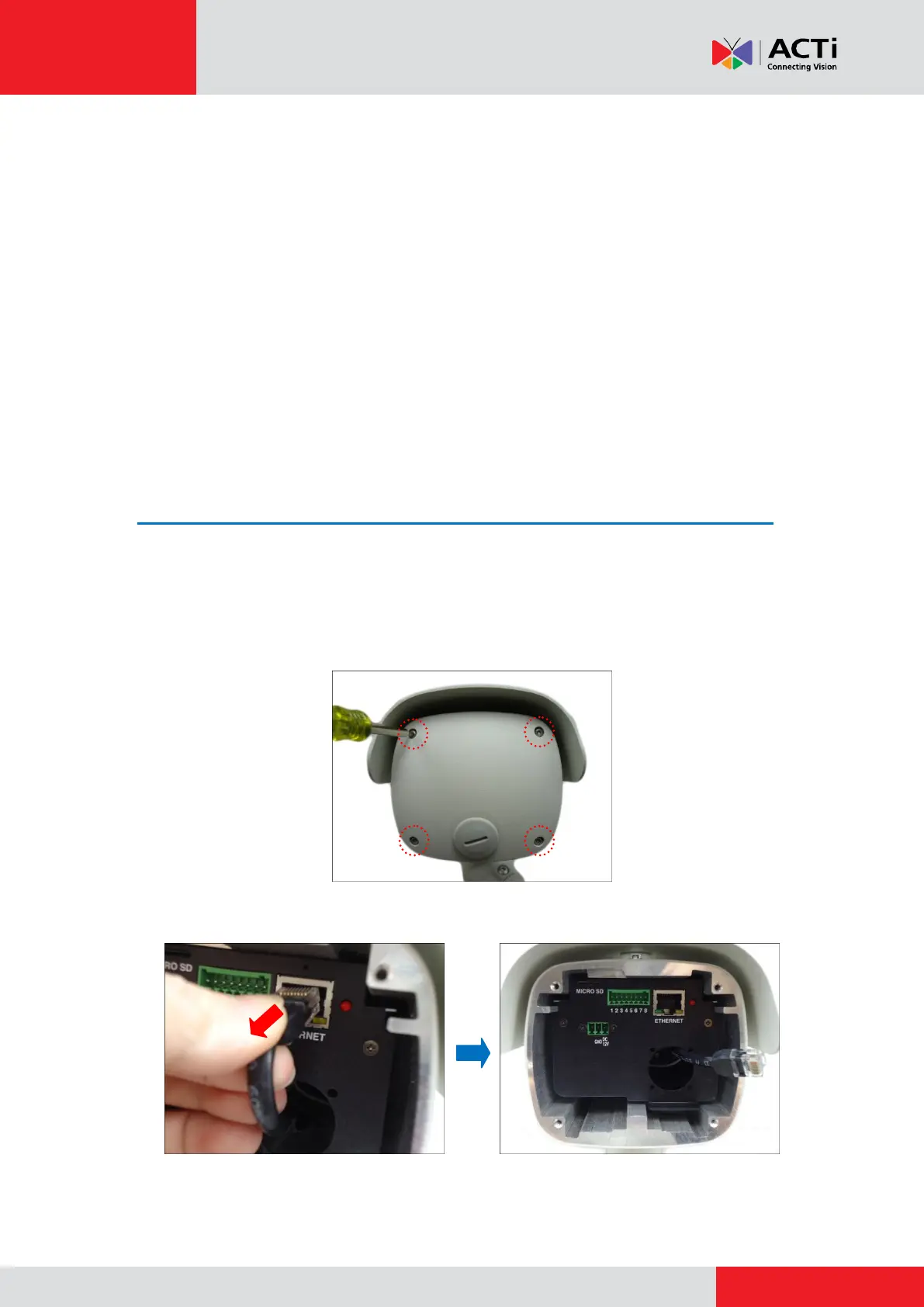 1. Loosen the four (4) screws to remove the back cover of the camera.