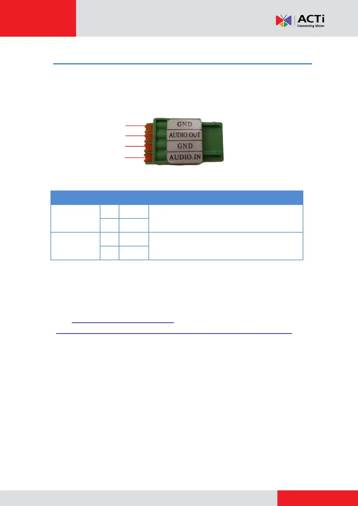 article How to Use Audio-in of ACTi Cameras, downloadable from the link below