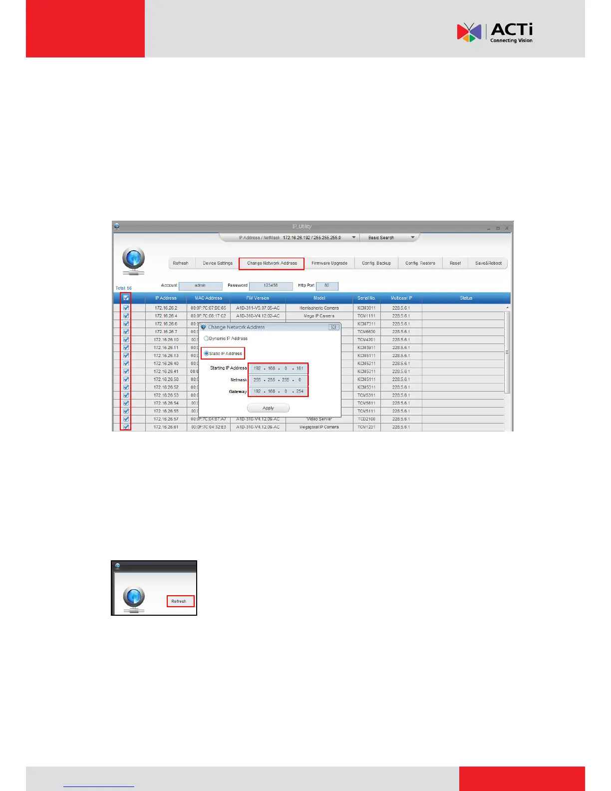 Later, by pressing the “Refresh” button of the IP Utility, you will be able to see the list of cameras