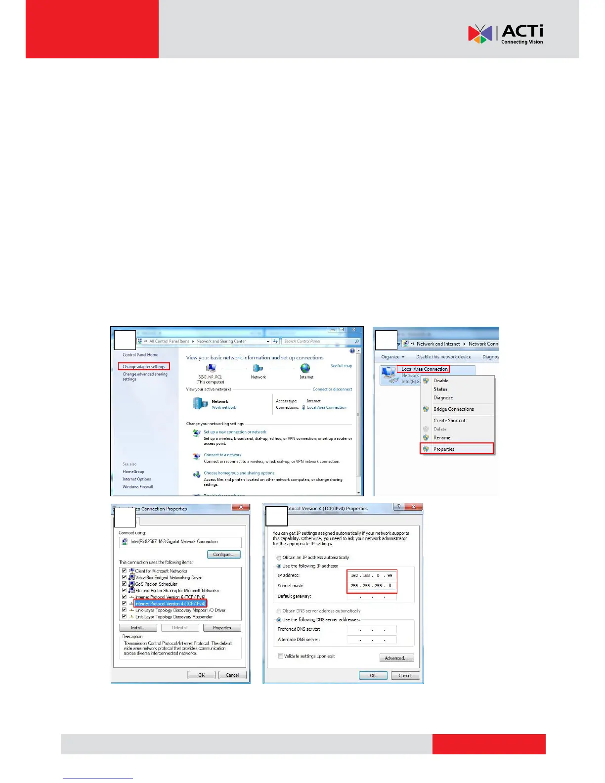 192.168.0.99 and set Subnet Mask to 255.255.255.0 by using the steps below: