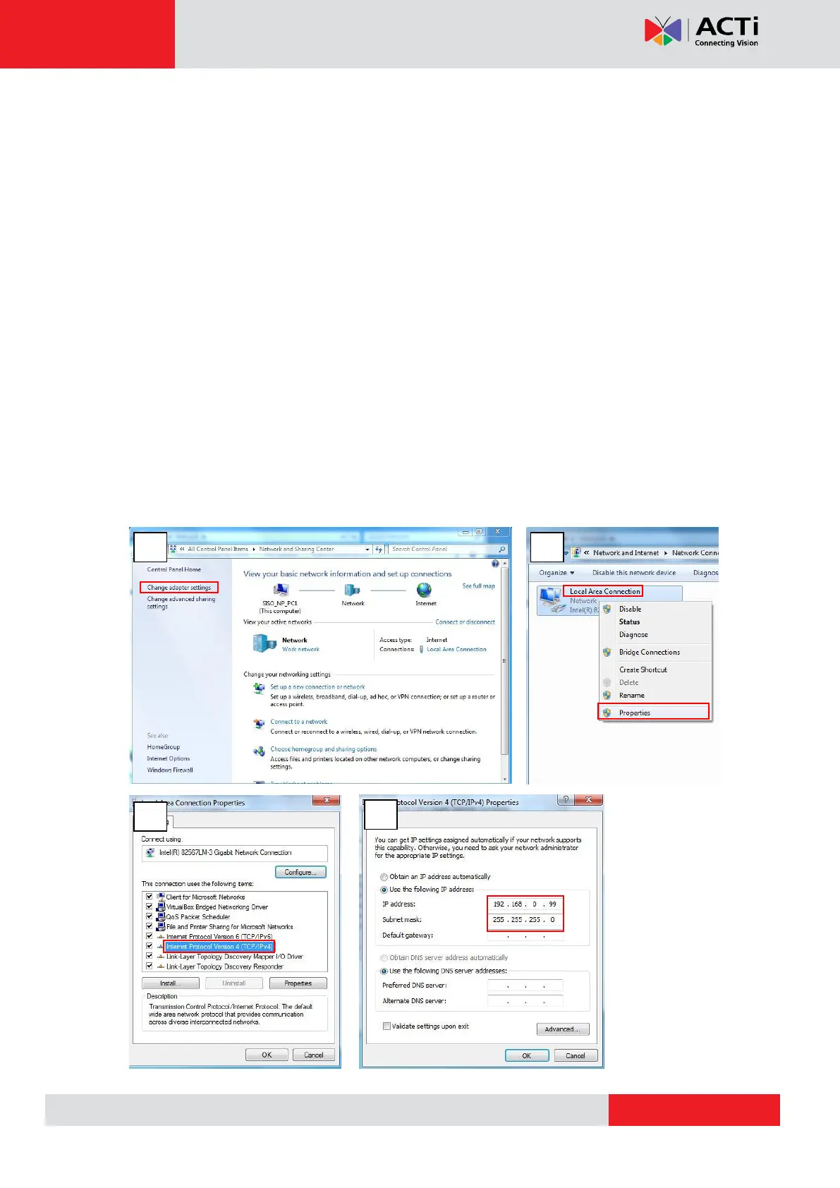 192.168.0.99 and set Subnet Mask to 255.255.255.0 by using the steps below: