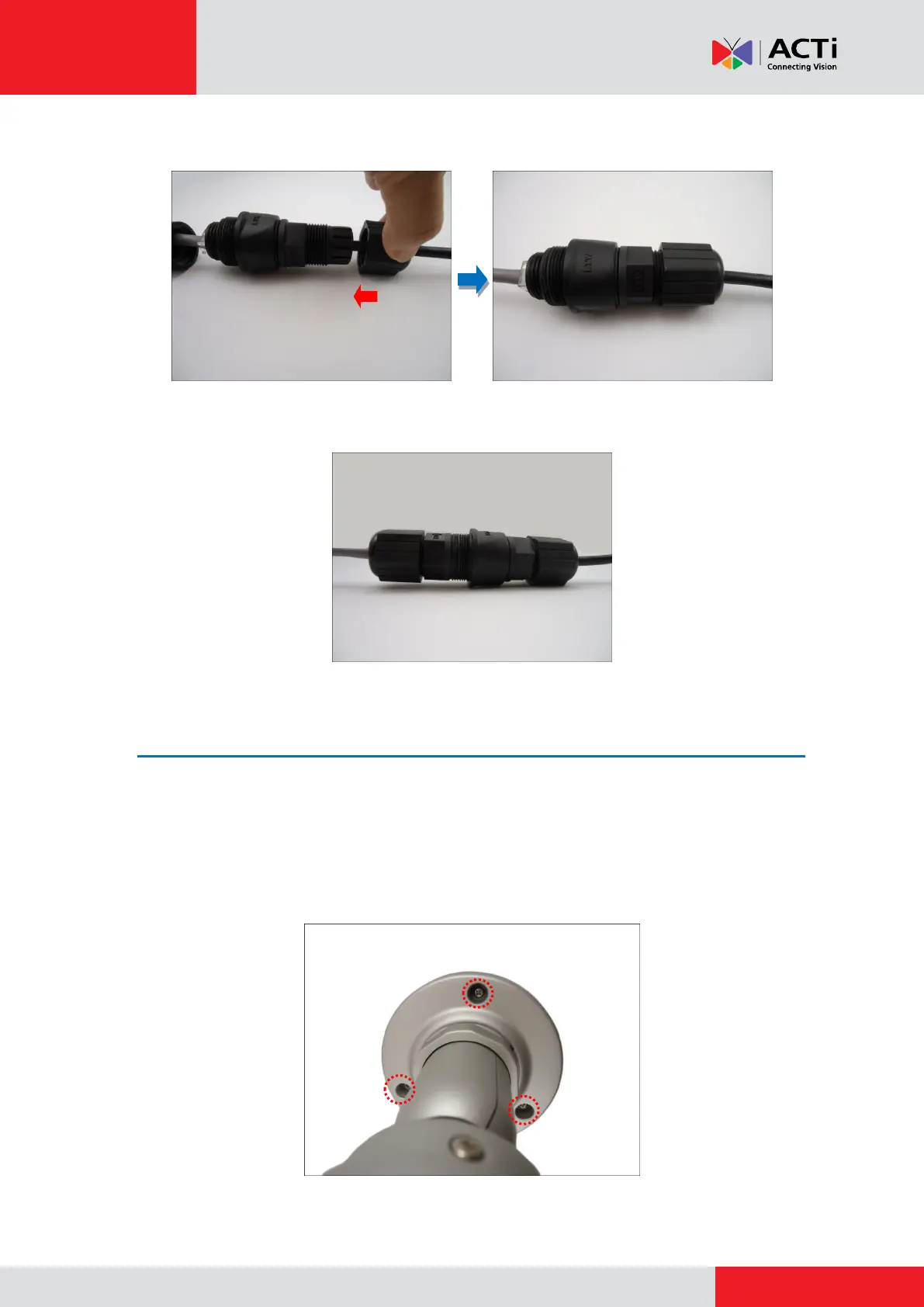 2. Attach the camera to the surface using the three (3) supplied screws. If the cables will be