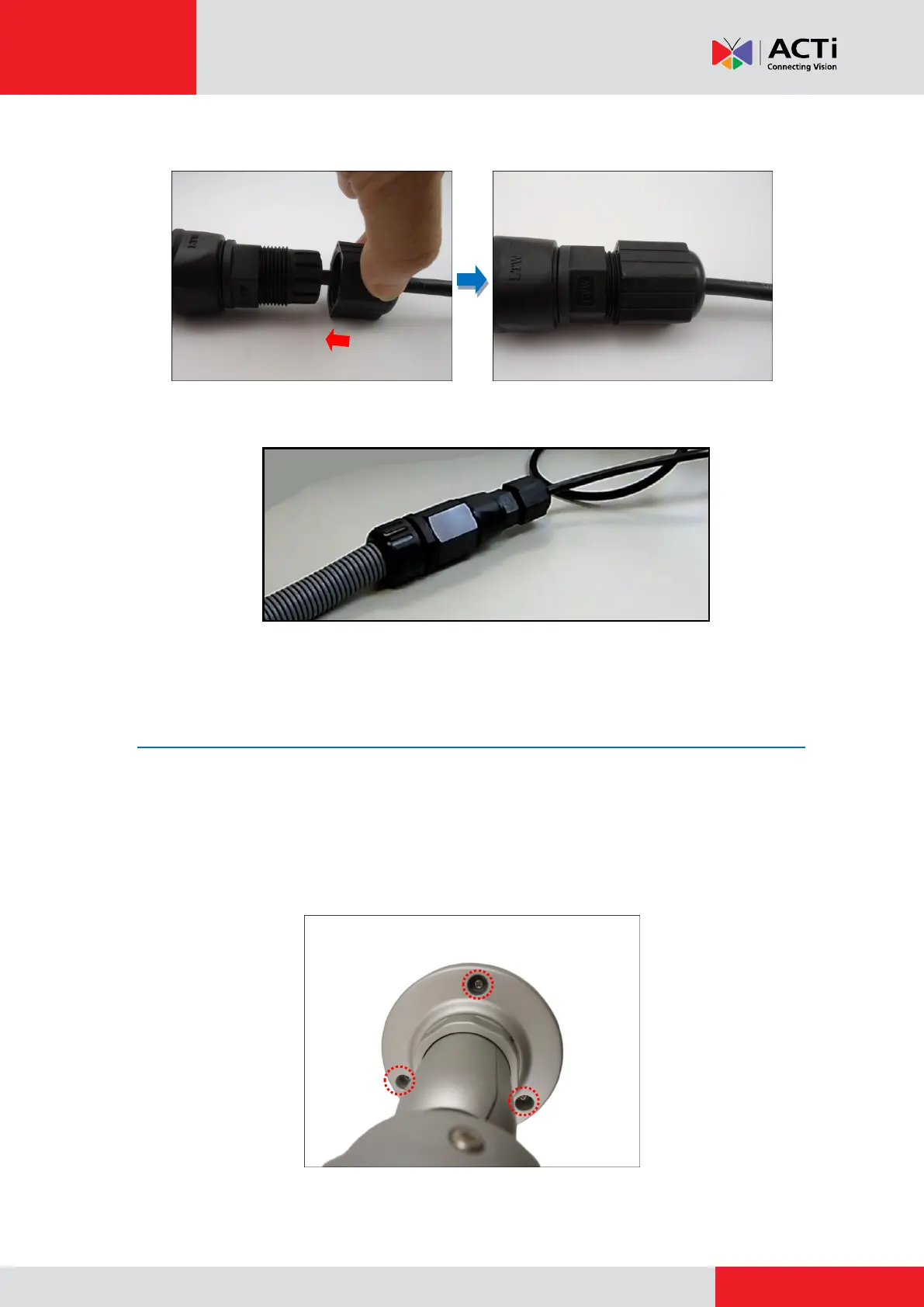 2. Attach the camera to the surface using the three (3) supplied screws. If the cables will be