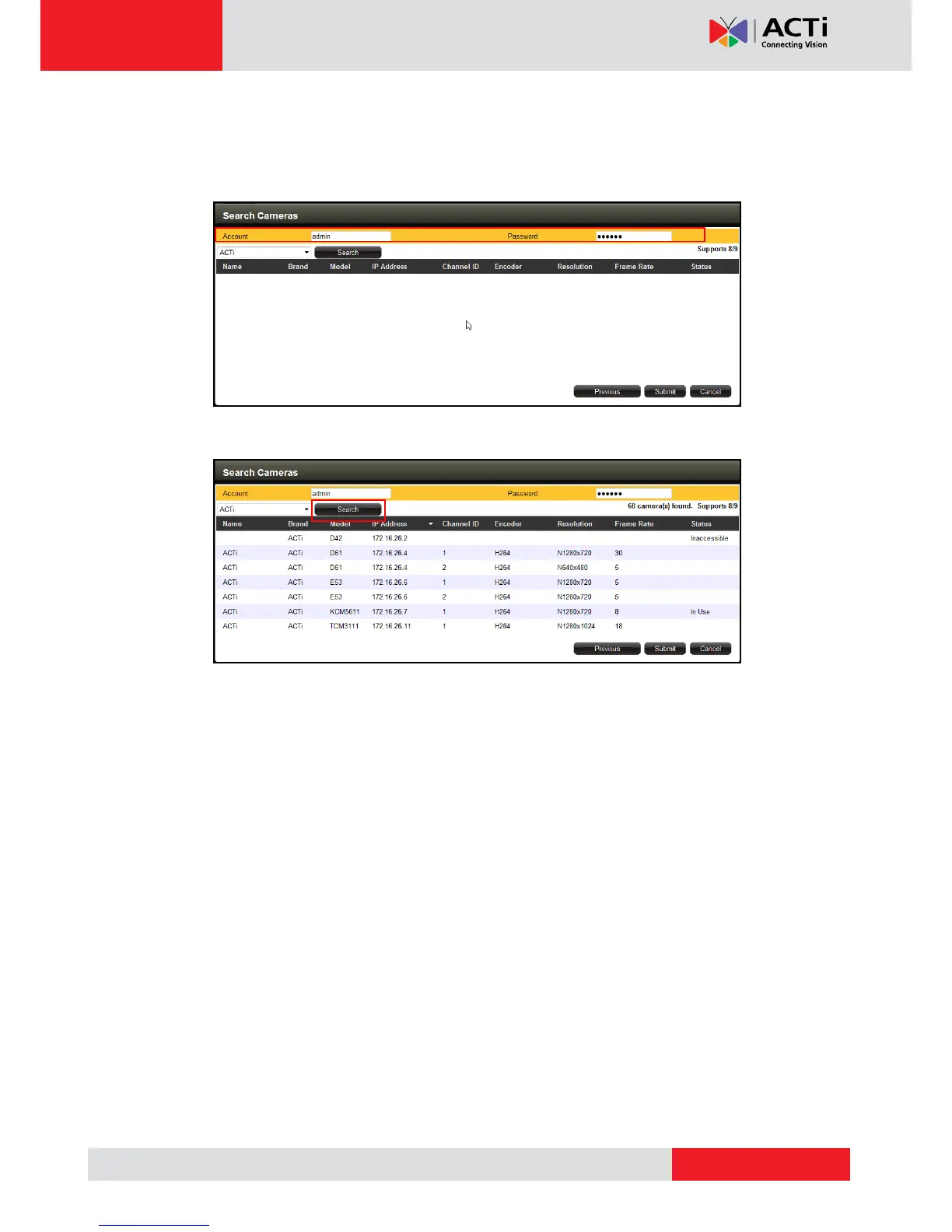 4. The Search Cameras screen appears. The default Account “Admin” and Password