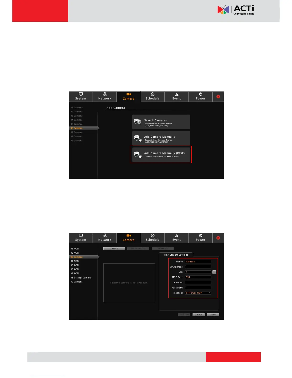 Camera Manually (RTSP) function. This feature is useful when adding third party cameras