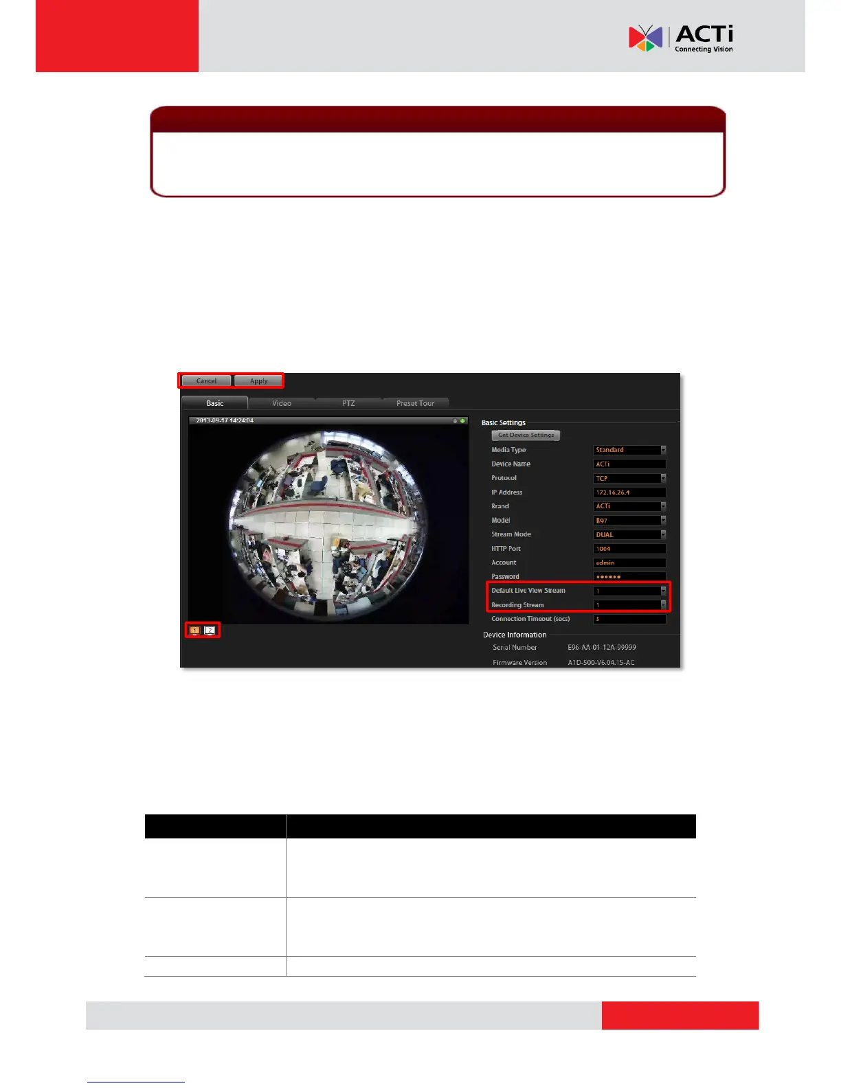 Device Serial Number, Firmware Version. If the device supports dual stream, Stream