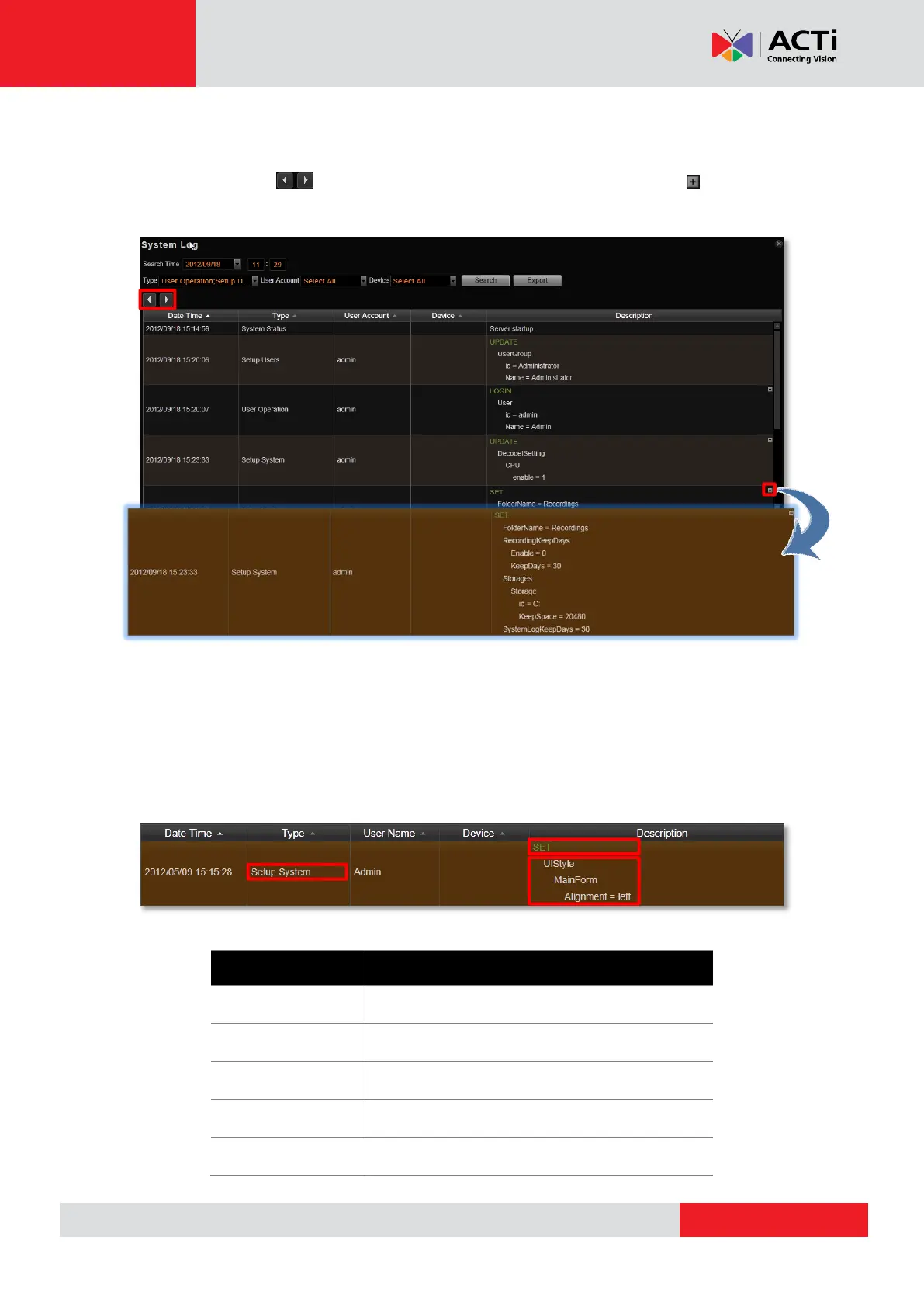 A log entry contains several kinds of information including Date Time, Type, User Account,