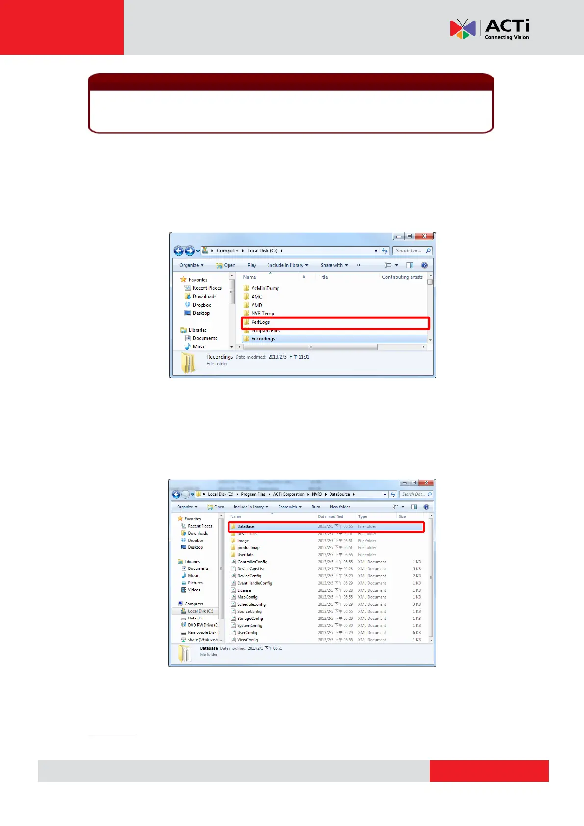 recorded video clips. Enter the server program folder ACTi Corporation\NVR3\DataSource,