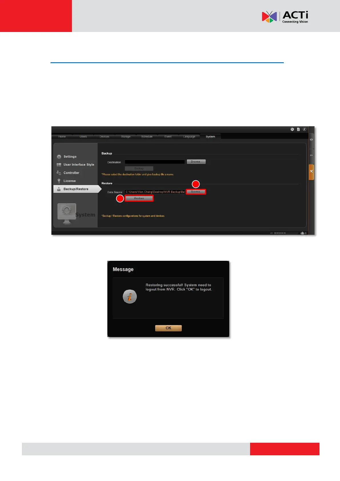 3. The restoring process requires logging out of the NVR server. After restoring is done, you
