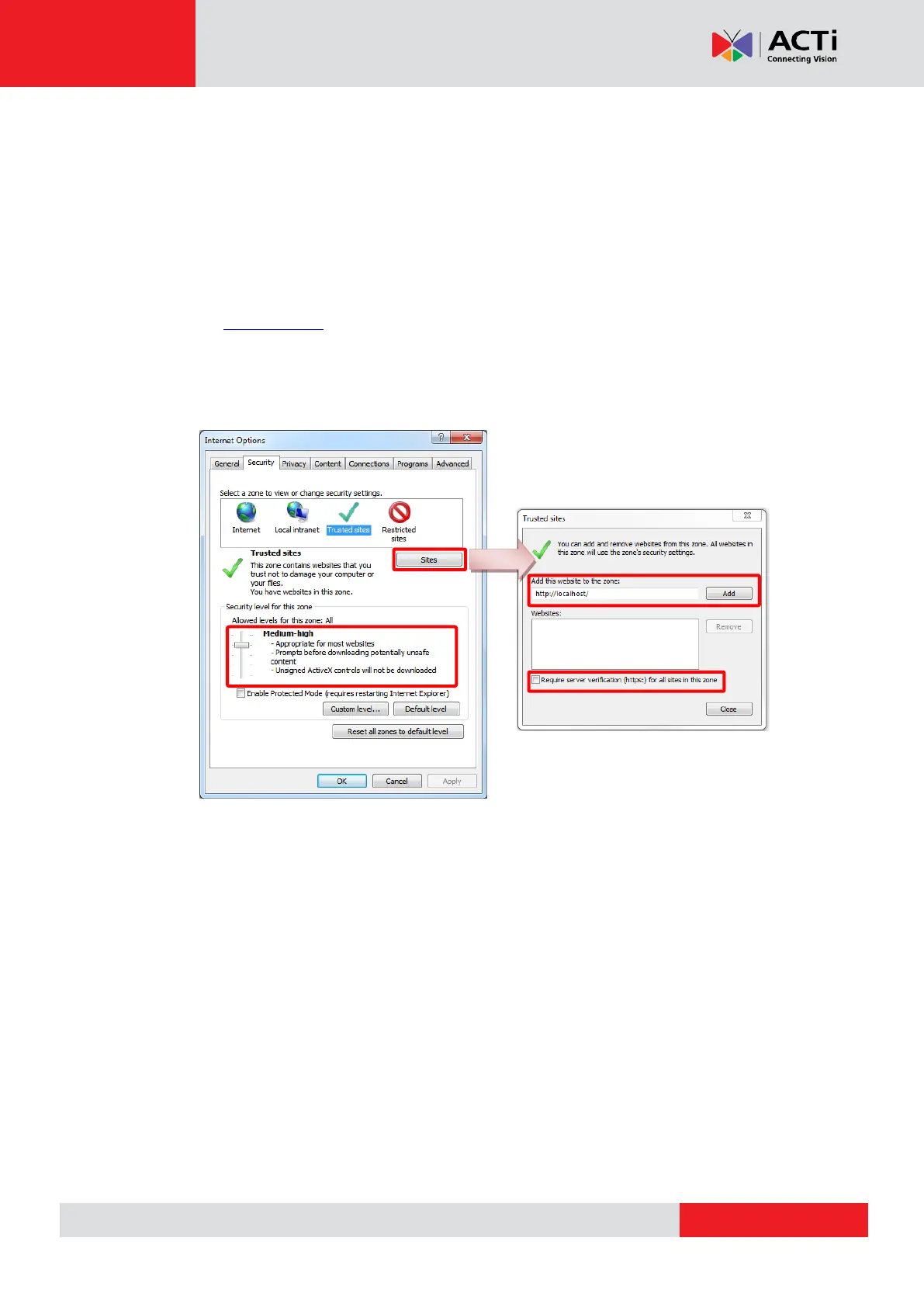 3. Add http://localhost or the NVR server IP to the zone, and clear the box “Require