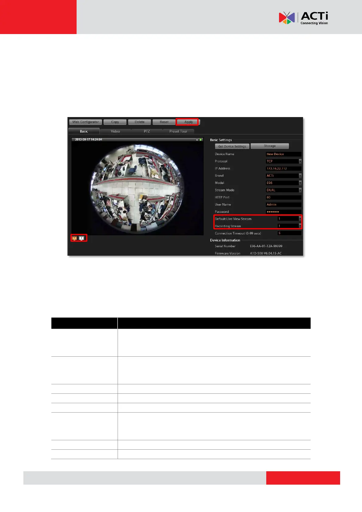 Device Serial Number, Firmware Version. If the device supports dual stream, Stream