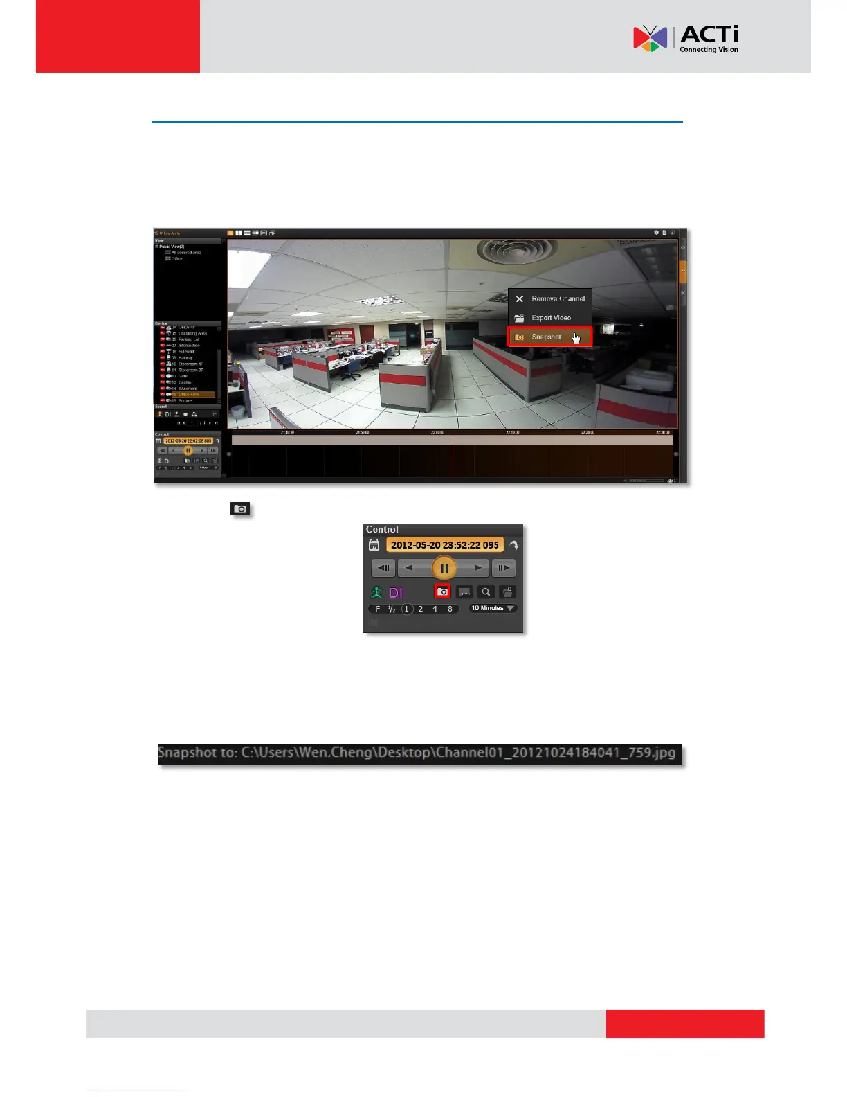 You may save the snapshot of focused channel to NVR server computer during playback.