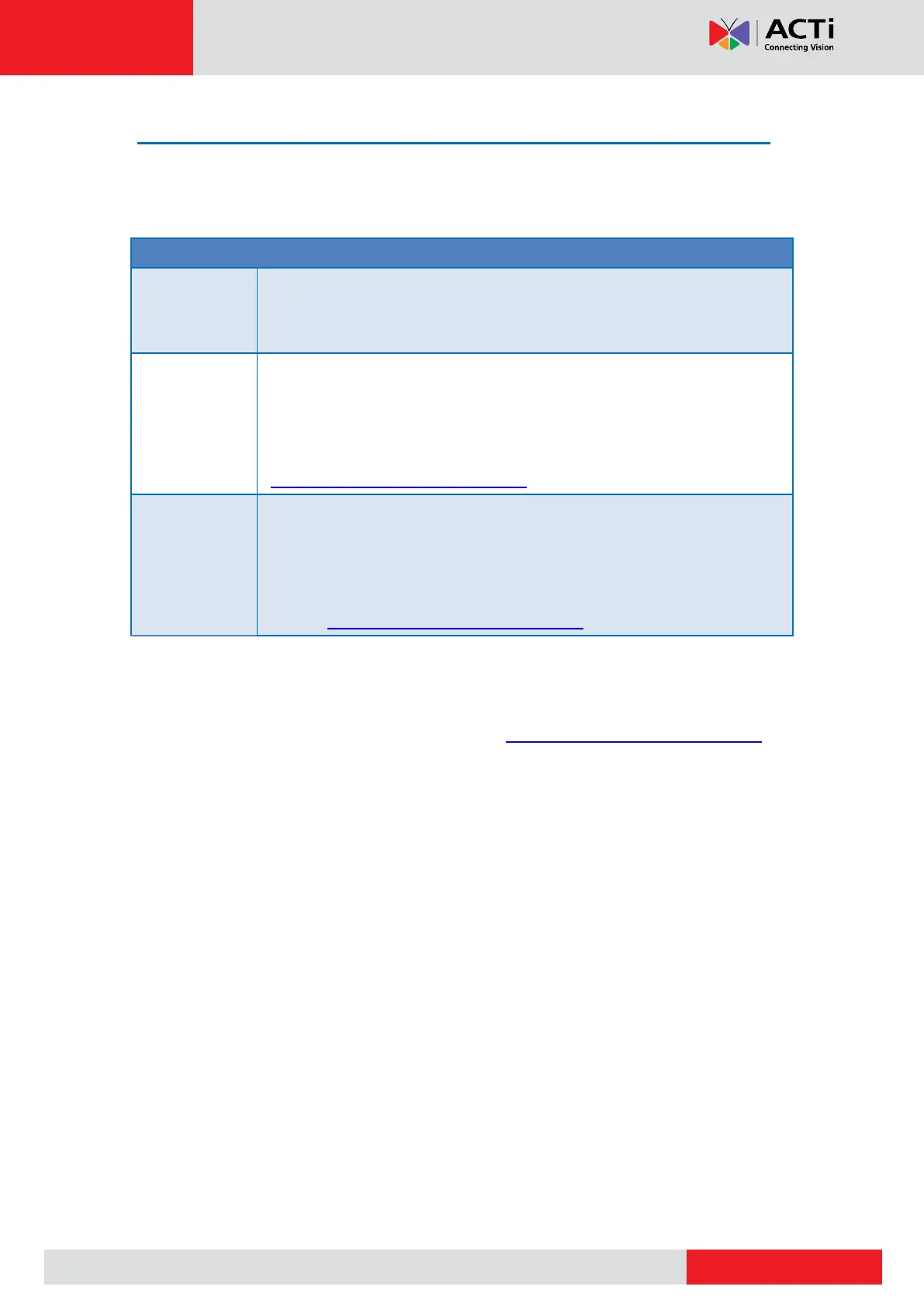 (http://www.acti.com/mountingselector). For indoor model only.