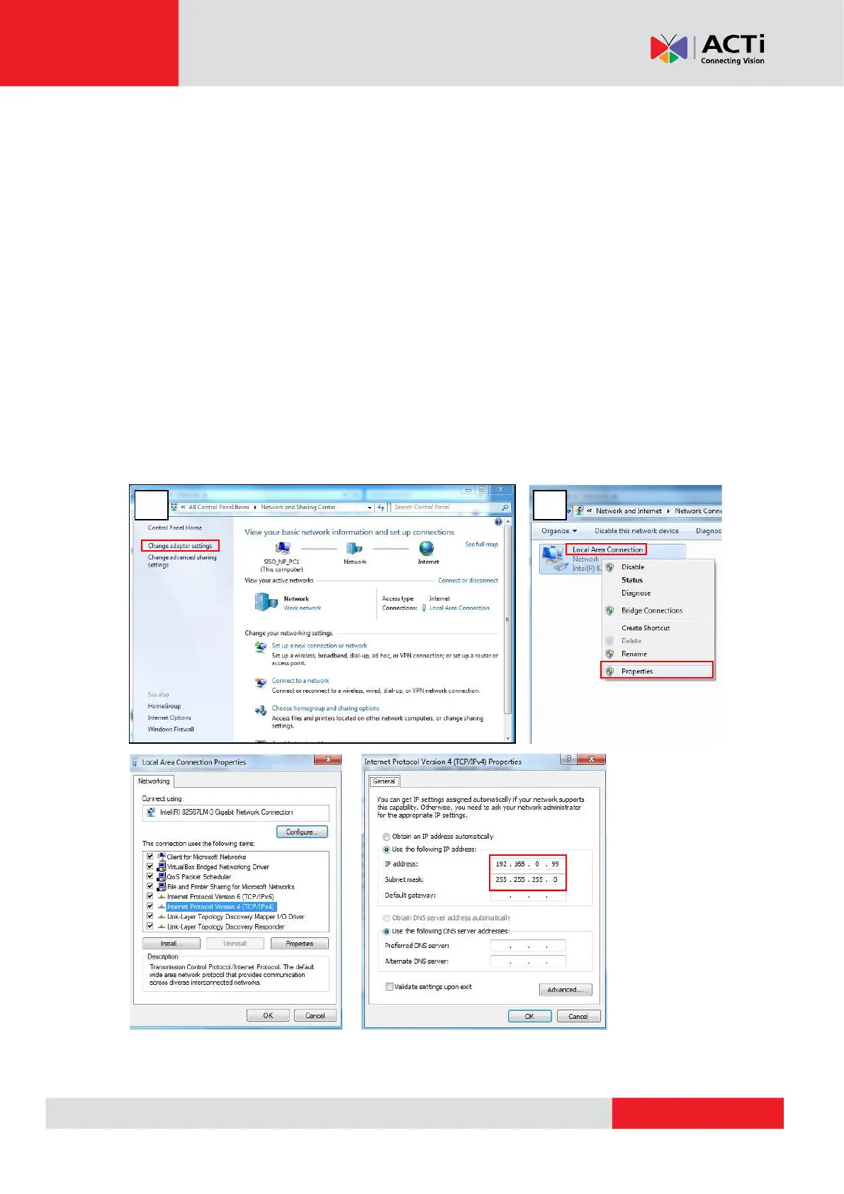In the following example, based on Windows 7, we will configure the IP address to 192.168.0.99