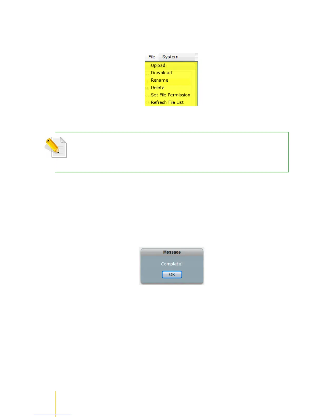 Under File menu, user can select the following functions: Upload, Download, Rename, Delete, Set File