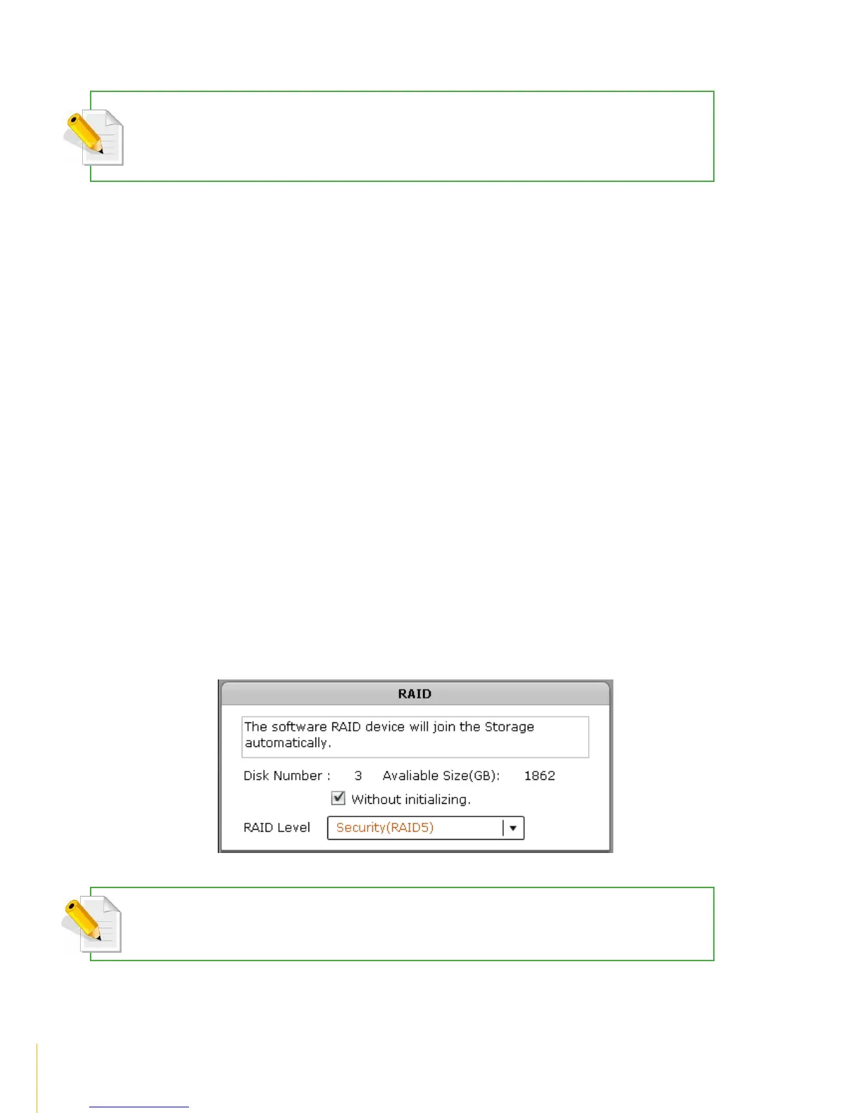 NOTE: To initialize the RAID, remove the check mark in the Without initializing option. Initializing the RAID will