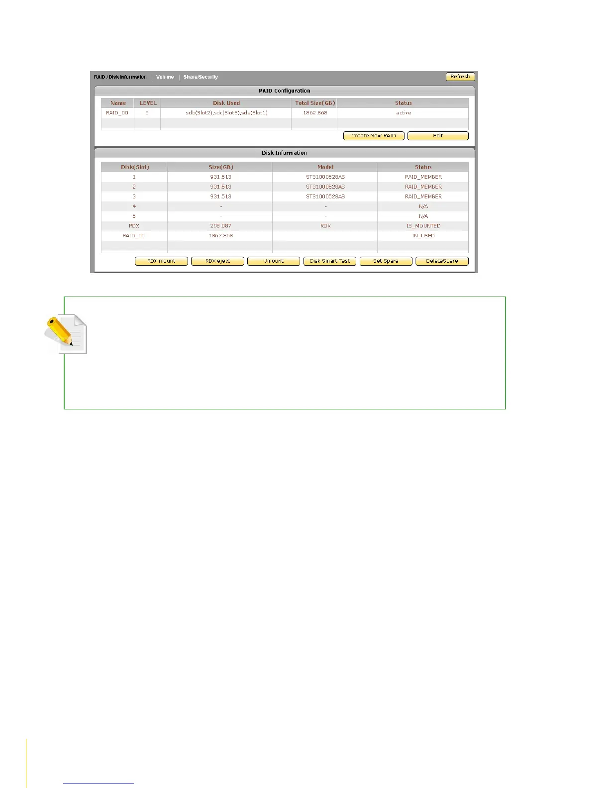 deleted using RAID/Disk InformationEditDelete. Once joined, the RAID disk status will be shown as