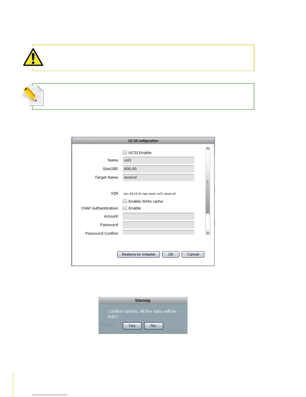WARNING: When iSCSI Configuration is removed and volume is restored as basic NAS volume, all the data in