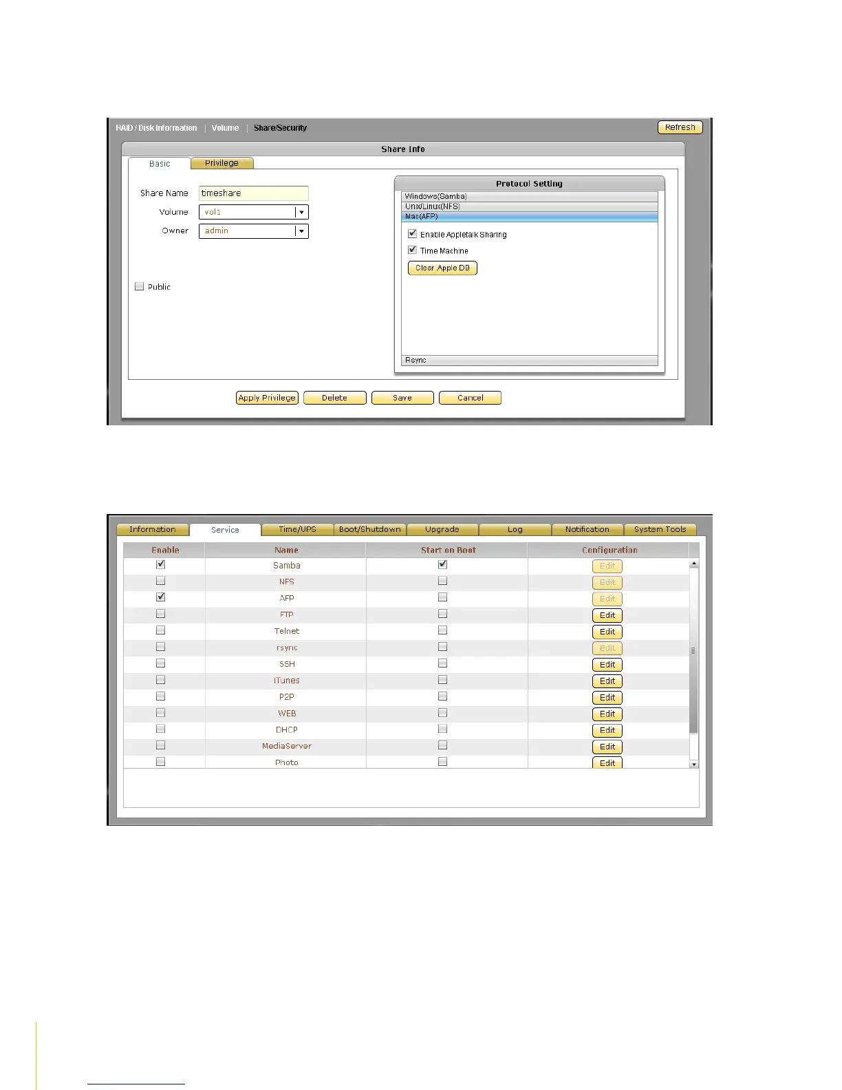 select Mac(AFP), and then tick Enable AppleTalk Sharing and Time Machine options. Click Save.
