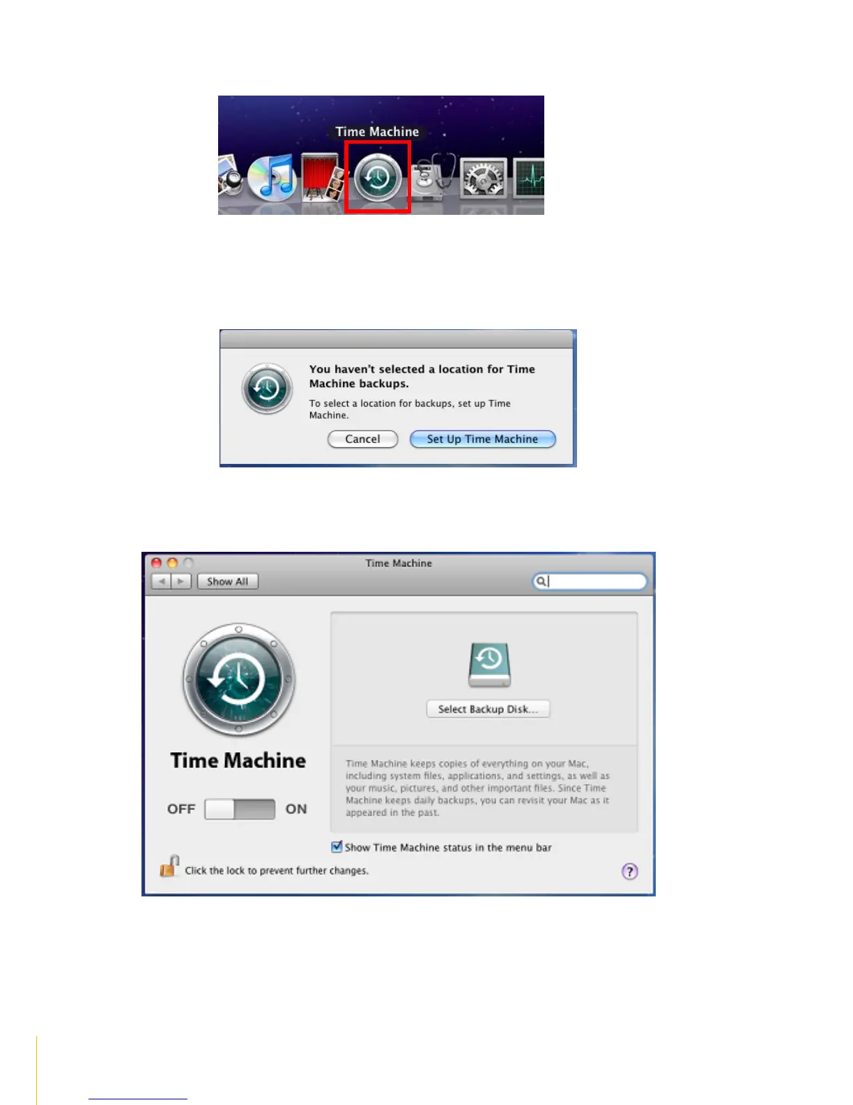 10. If the Time Machine has not been previously setup, a message will be shown as below. Then