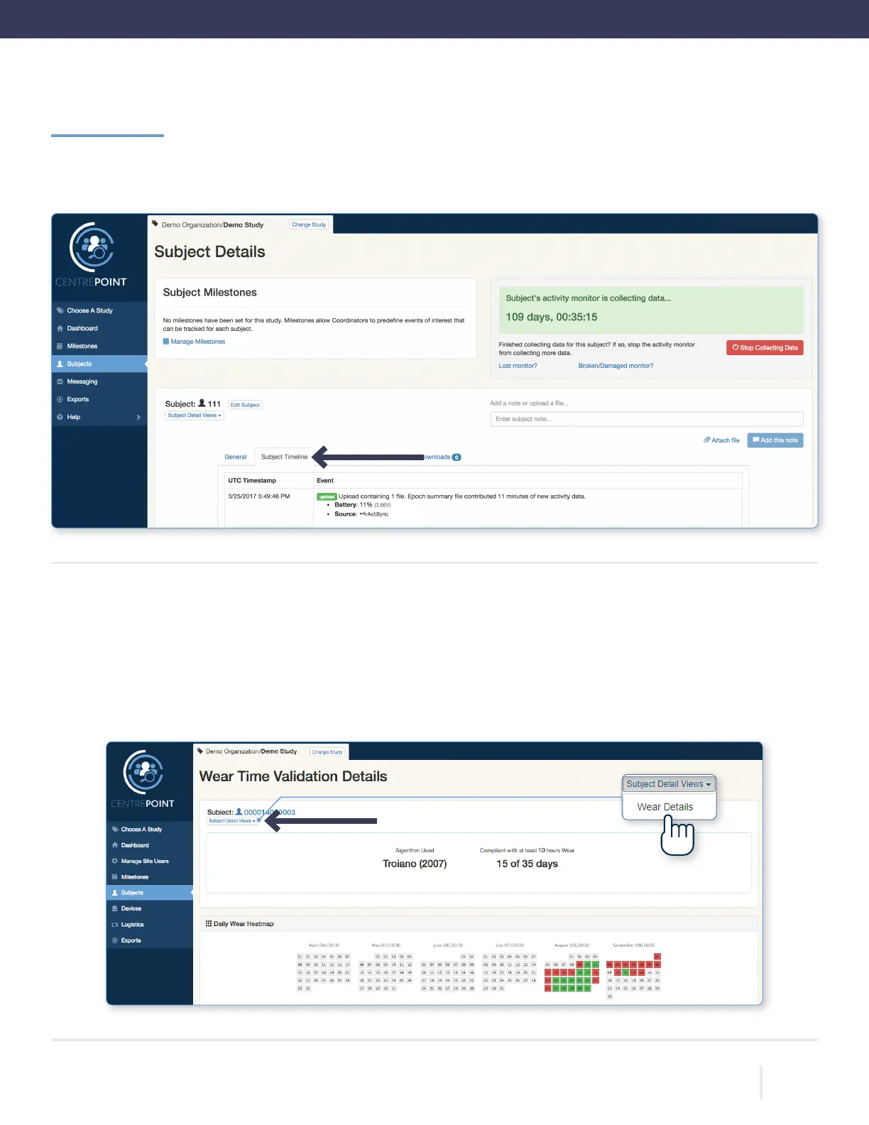 labeled “Subject Detail Views.” The “Wear Details” section displays daily details on subject wear time compliance. For this study,