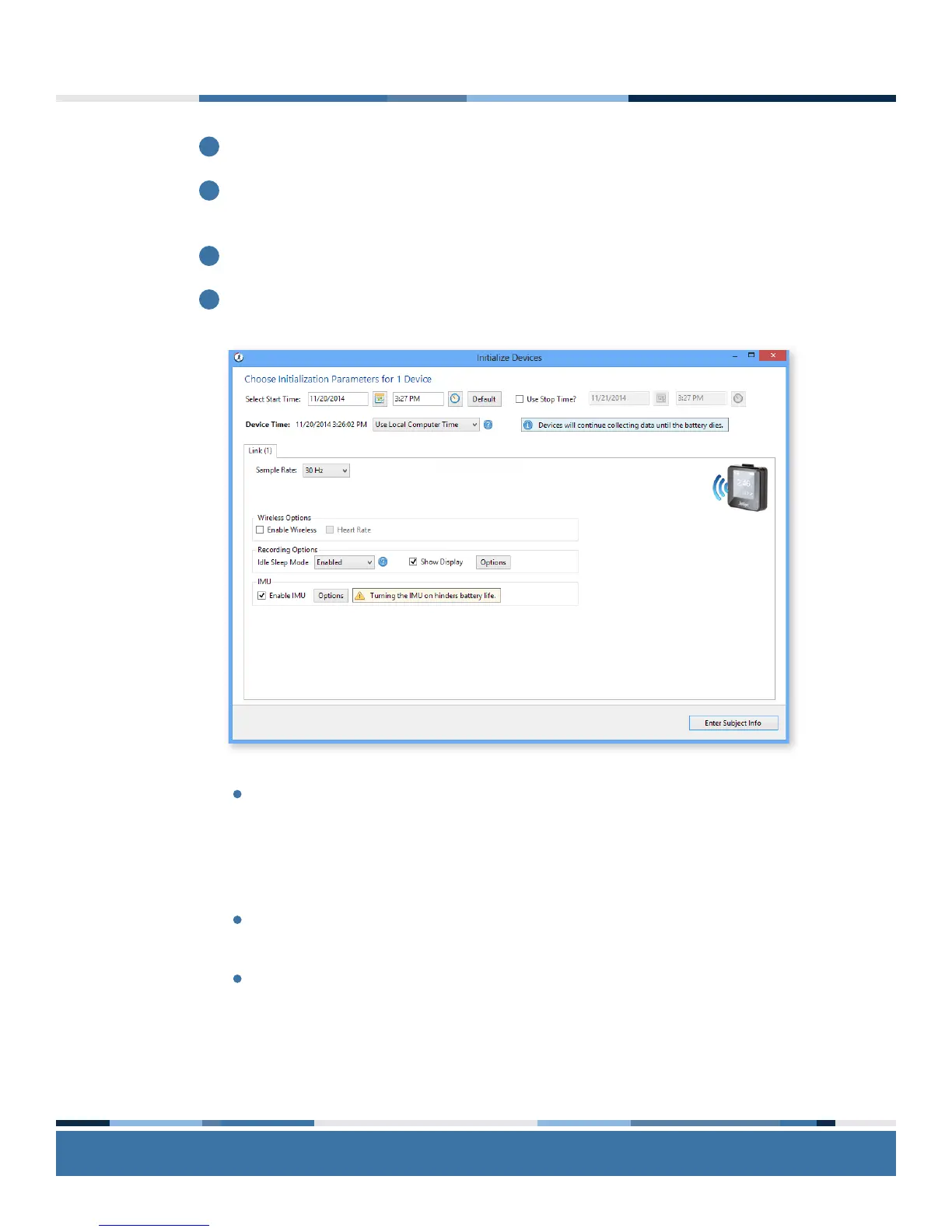 Select the device sampling rate ranging from 30 to 100 Hz. Note that higher sampling rates will result in