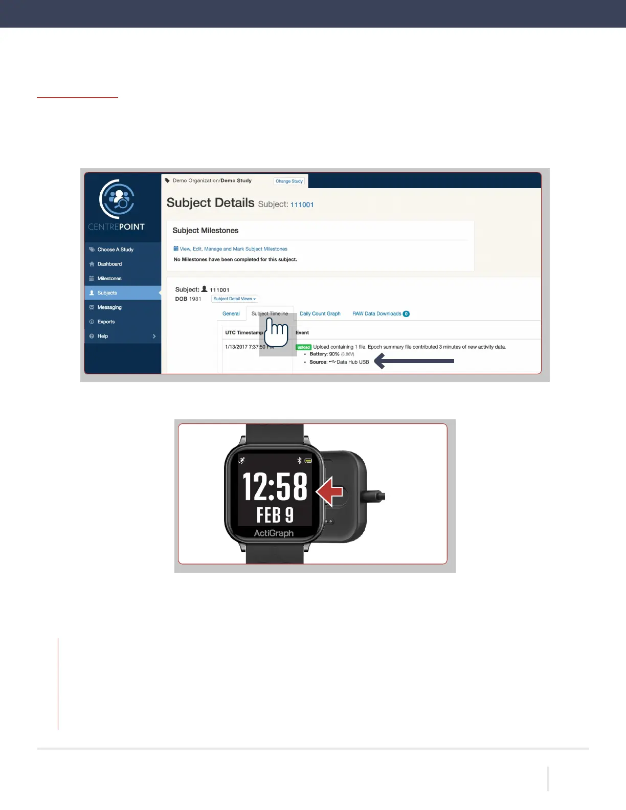 You will be directed to the “Subject Details” page. Select the “Subject Timeline” tab, and verify that an upload