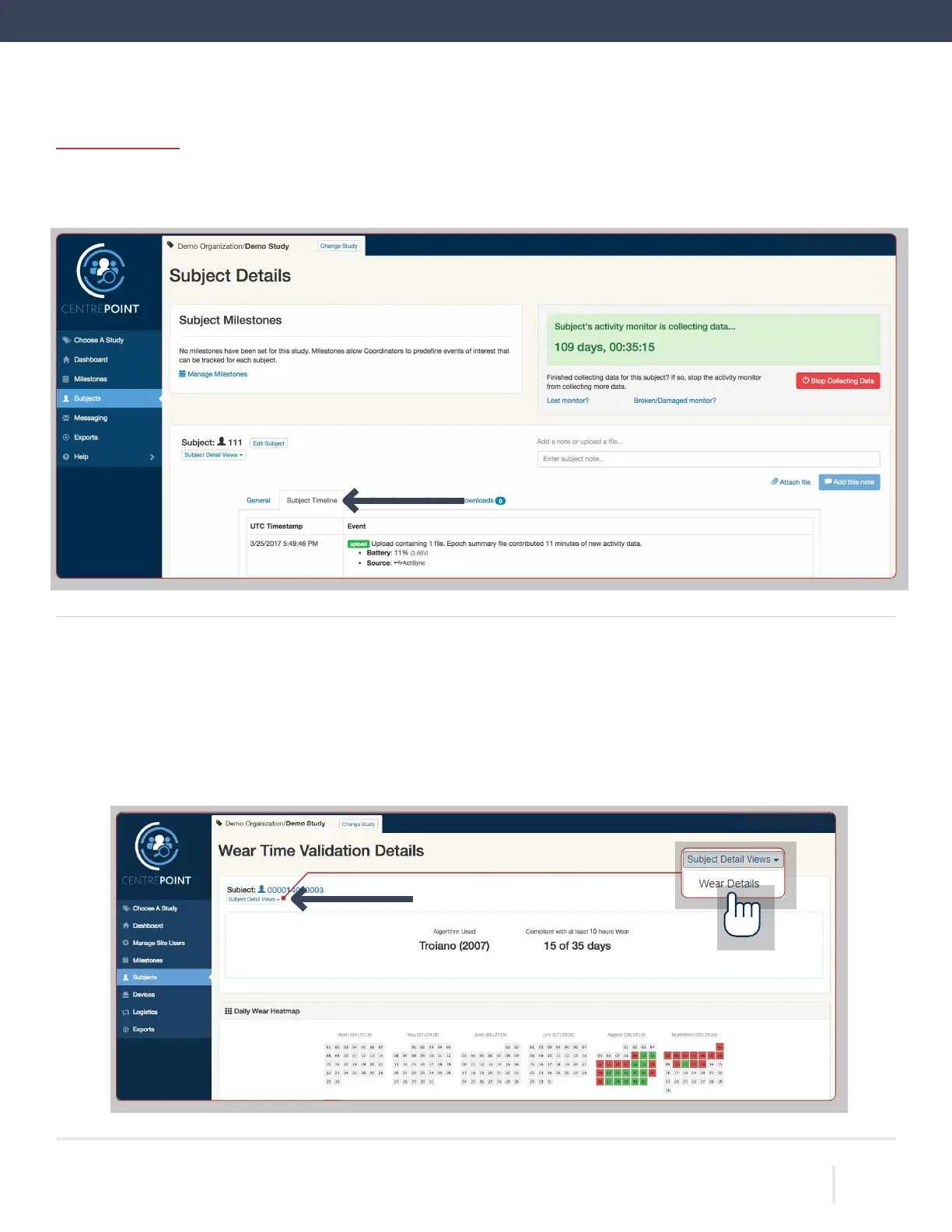 labeled “Subject Detail Views.” The “Wear Details” section displays daily details on subject wear time compliance. For this