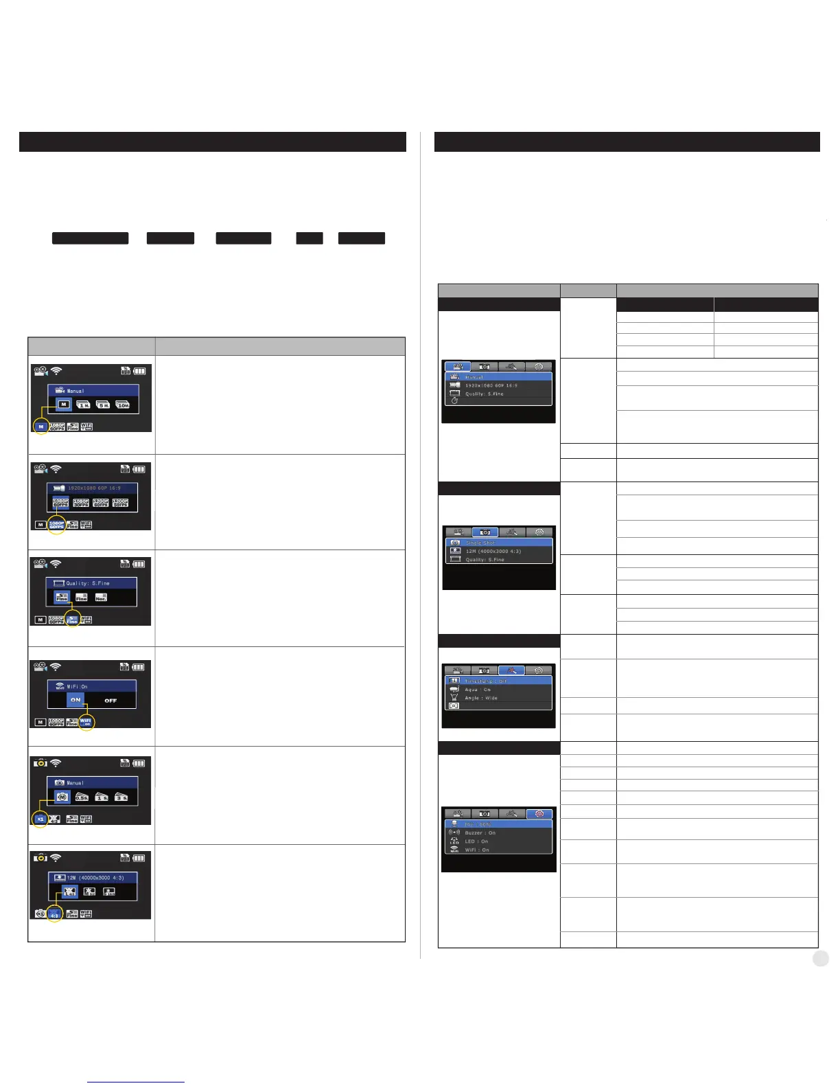 Aufnahmeoption → Auflösung → Bildqualität → WiFi → Verlassen