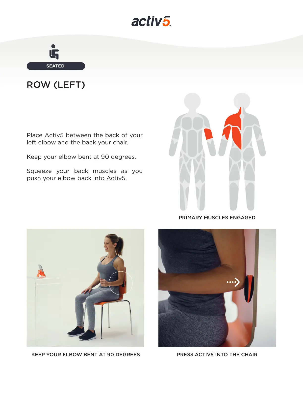 KEEP YOUR ELBOW BENT AT 90 DEGREES PRESS ACTIV5 INTO THE CHAIR