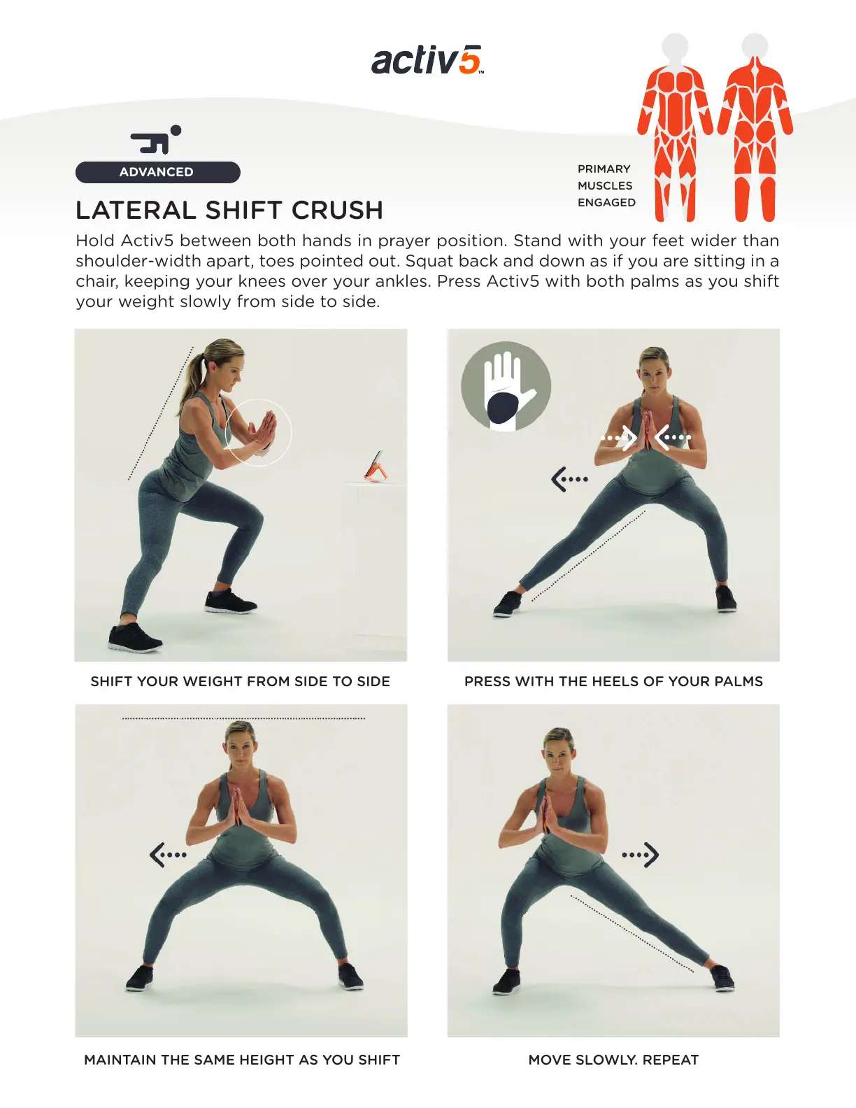 chair, keeping your knees over your ankles. Press Activ5 with both palms as you shift