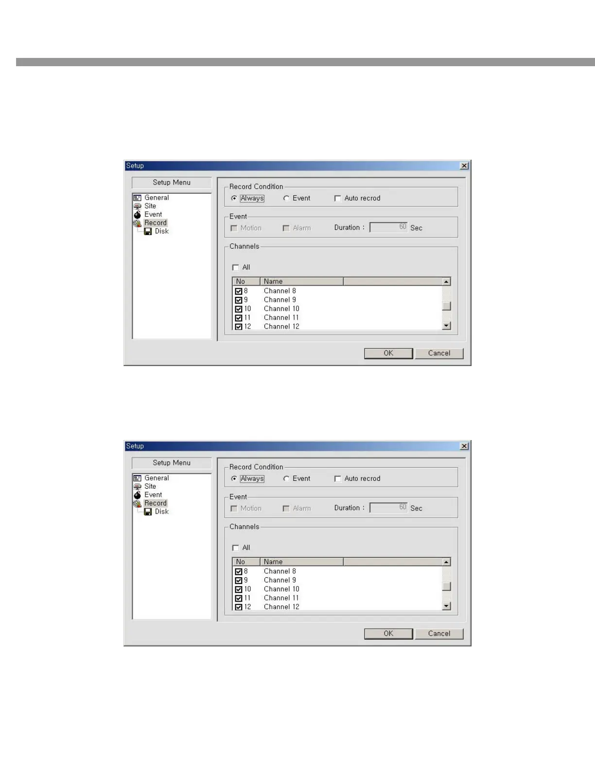 You can set the recording conditions for always, event and auto recording. And you also can set