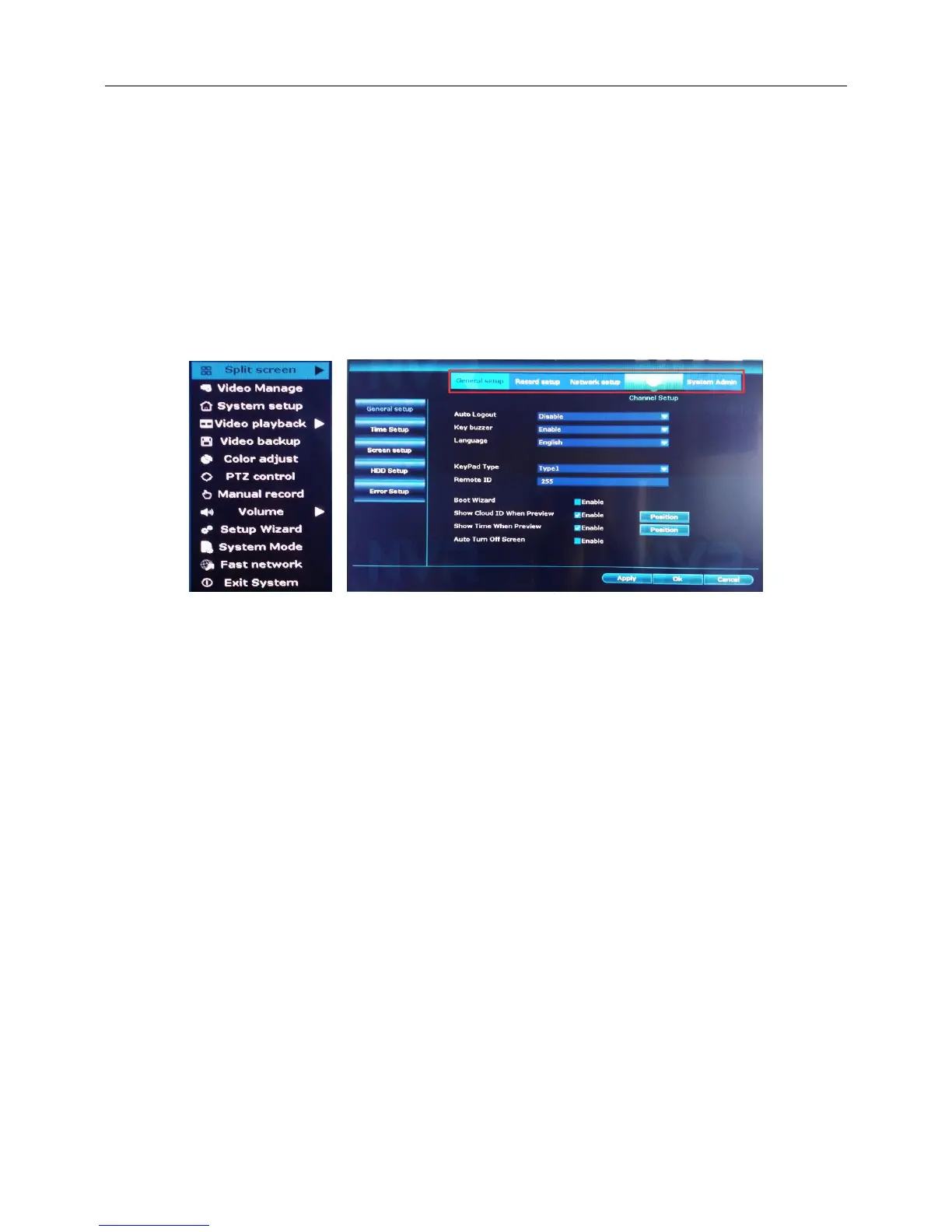 Set the system parameters such as General, Encode, Network, Add IPC,System time,Video standard,