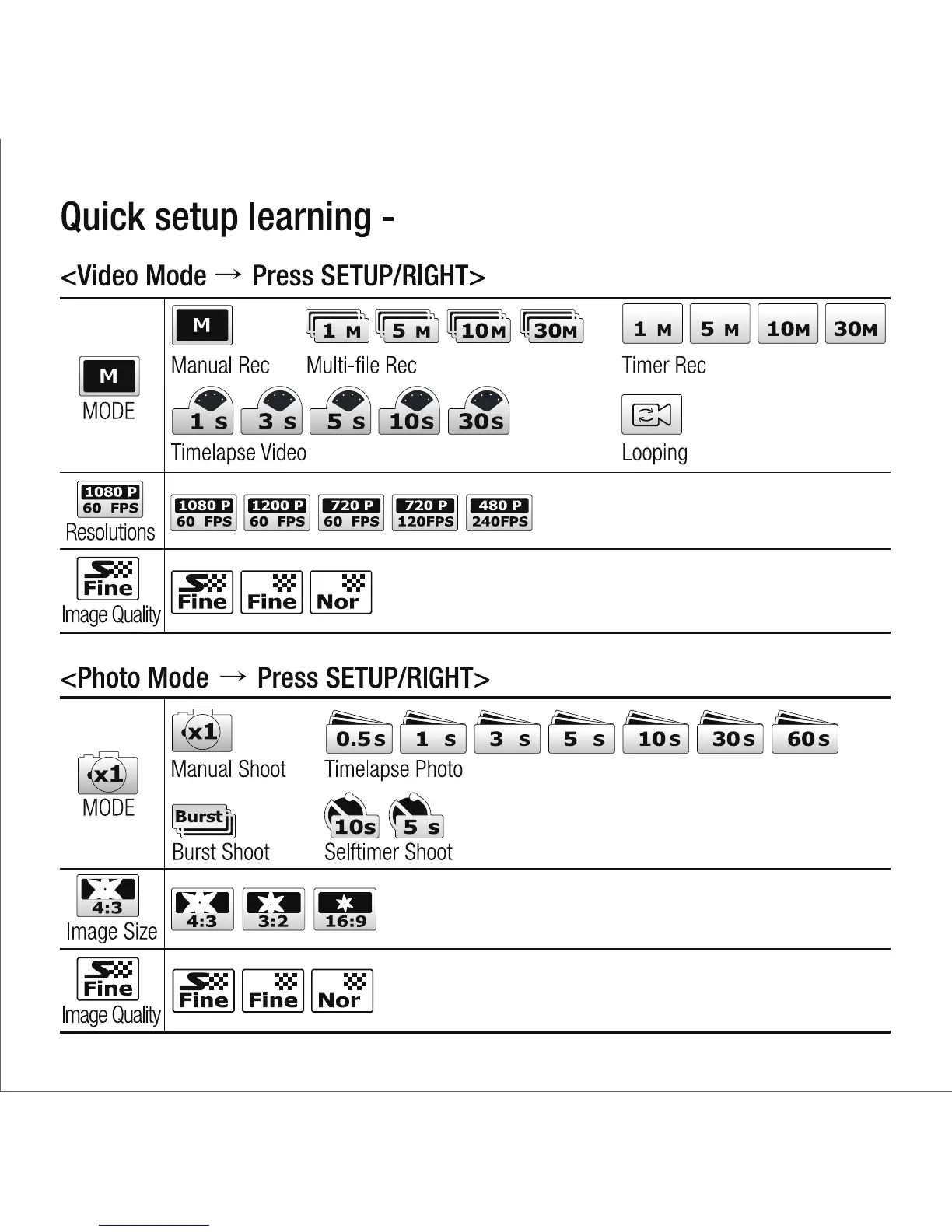 Activeon DX - Quick Setup Learning; Video Mode Settings; Photo Mode Settings