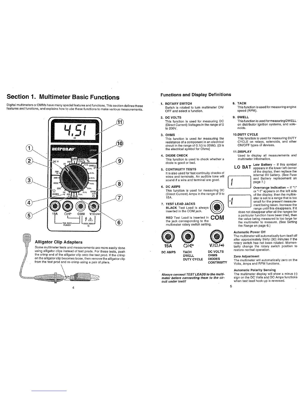 Actron CP7678 - Multimeter Basic Functions; Functions and Display Definitions; Alligator Clip Adapters