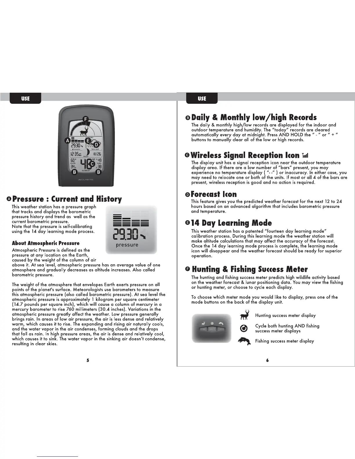 ACU-RITE 00250 - Use; Pressure: Current and History; Daily & Monthly Low;High Records; Wireless Signal Reception Icon