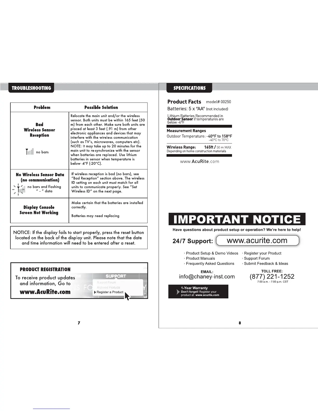 ACU-RITE 00250 - Troubleshooting; Specifications; Important Notice
