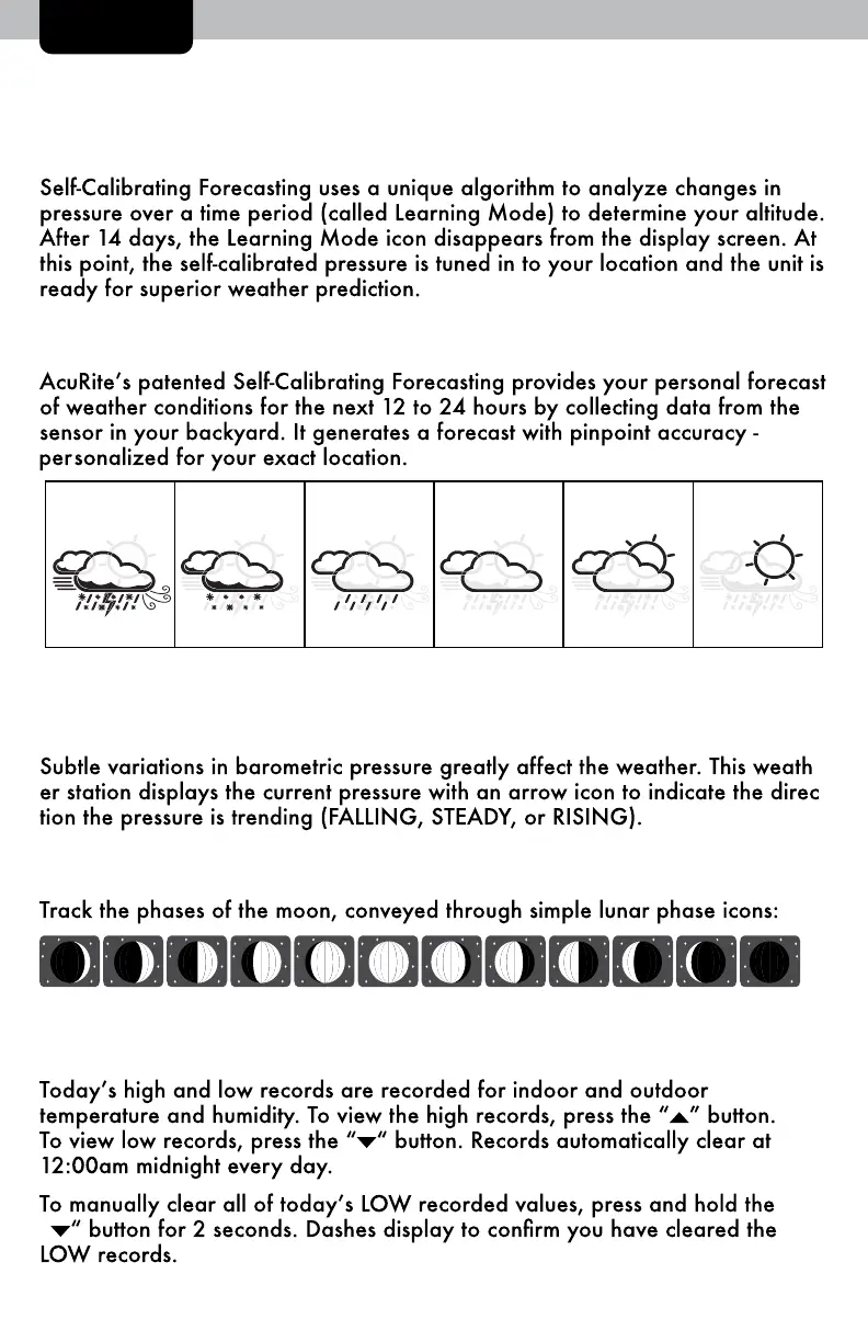 ACU-RITE 00829 - Weather Forecast Station Operation; Learning Mode for Forecasting; Understanding Weather Forecasts
