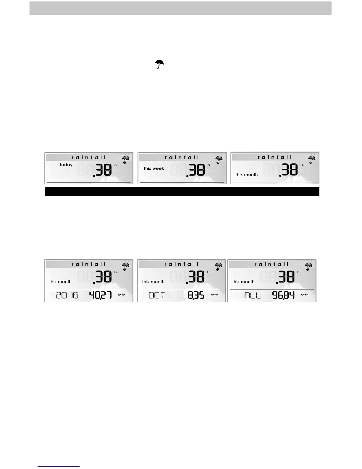 recent rainfall total). Press the “ ” button to review historical rainfall records.