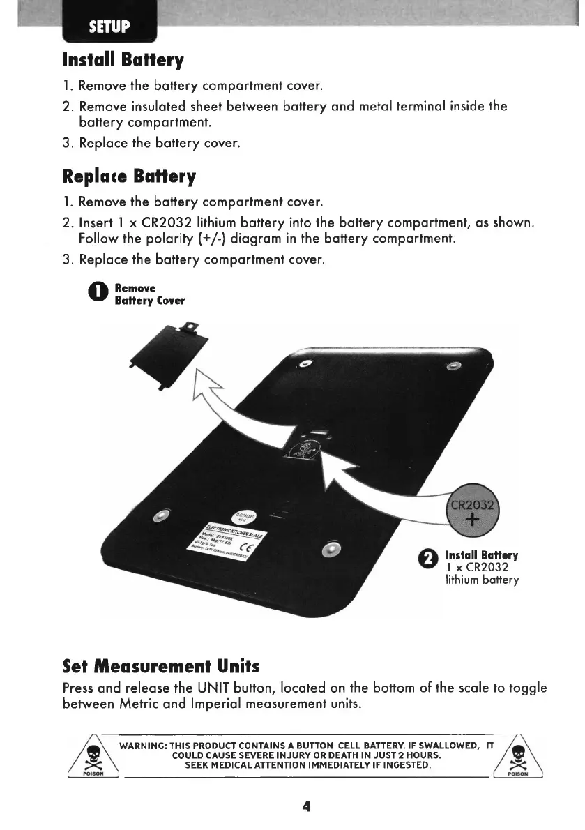 ACU-RITE 4017 - Setup; Install or Replace Battery; Replace Battery; Set Measurement Units