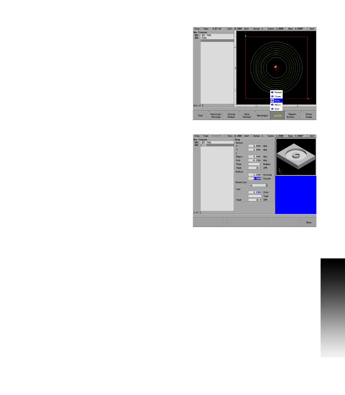 A ring is a circular pocket with a circular island in the center. A ring is