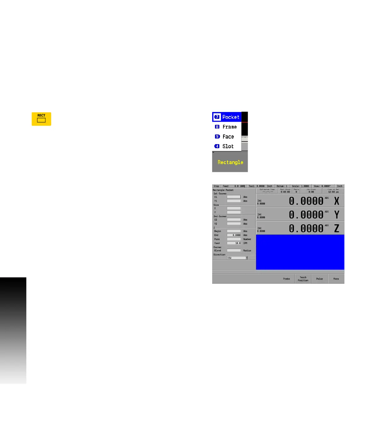 The RECT, or CIRCLE keys as an example access popup menus to