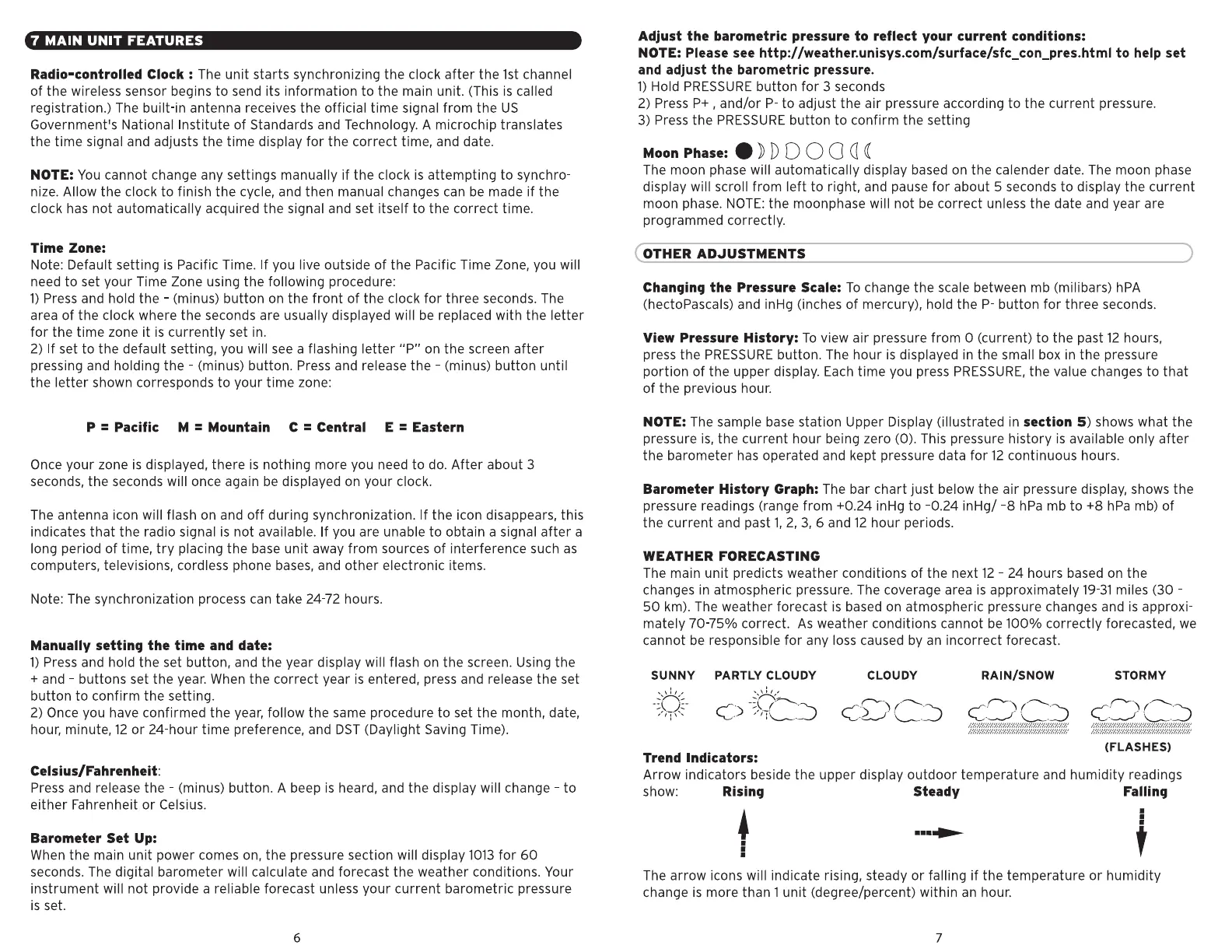 The main unit predicts weather conditions of the next 12- 24 hours based on the