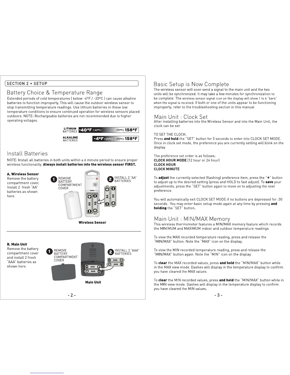 AcuRite 00606 - Setup; Battery Choice and Temperature Range; Battery Installation; Clock Setting